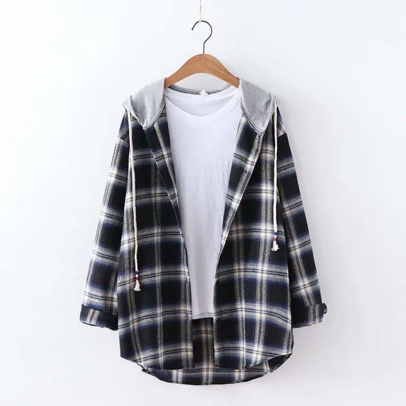 Hooded Loose Plaid Long Sleeved Shirt Women