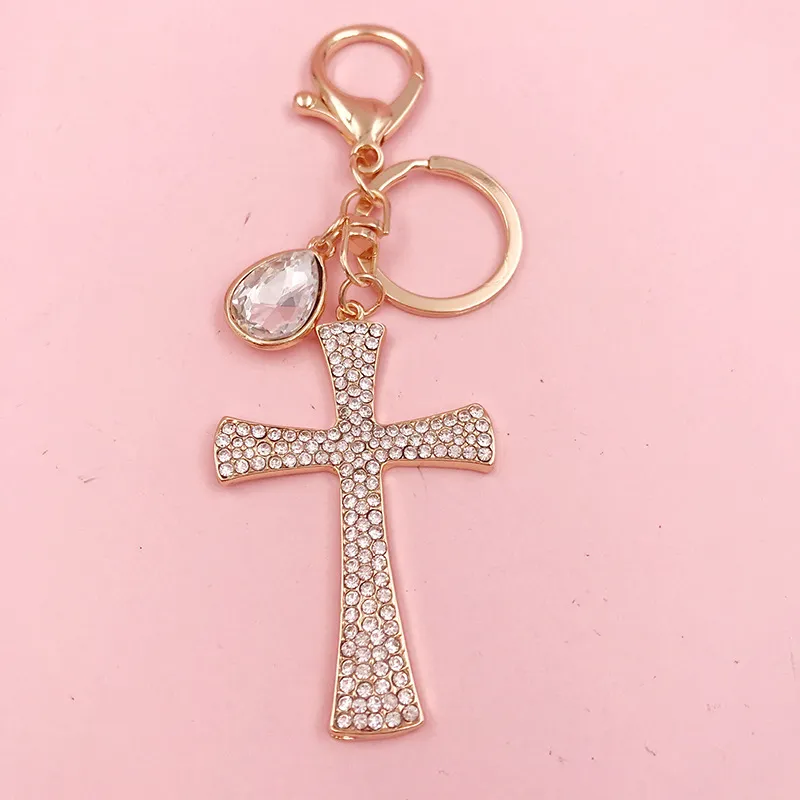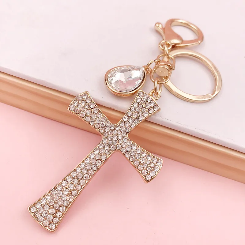 Hot Sale Christian Water Drop Diamond Cross Keychain Metal Pendant Female Bag Accessories