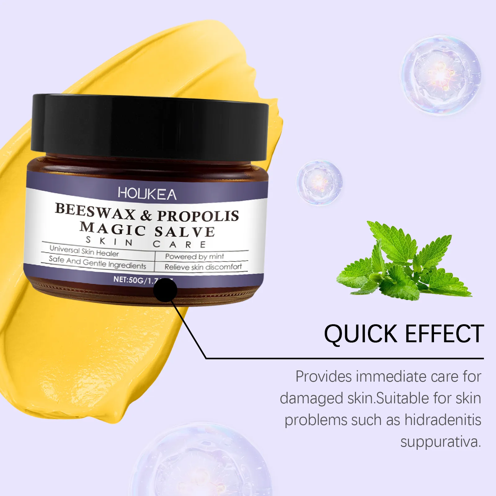 Houkea Beeswax & Propolis Magic Salve is crafted using natural beeswax, propolis, and mint, known for their powerful skin-healing and anti-inflammatory properties. This salve provides a soothing effect on the skin, helping to reduce irritation and relieve discomfort. The beeswax and propolis work together to form a protective barrier on the skin, keeping it hydrated and helping to lock in moisture.