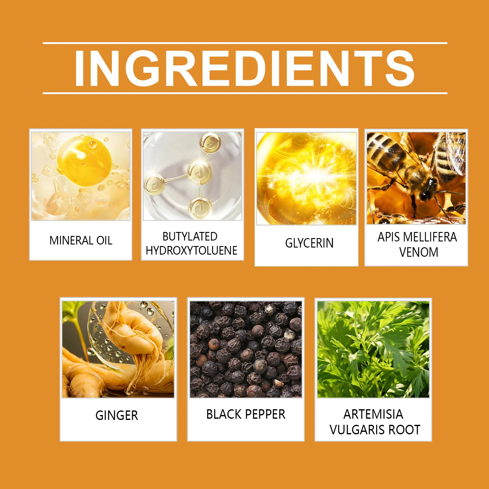 Ingredients: mineral oil, butylene, glycerol, black pepper, ginger root bee venom, mugwort