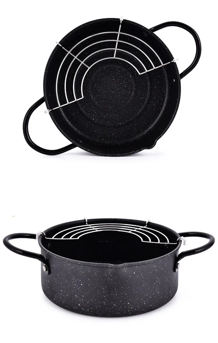 With a filter, this pan will solve the problem that the room is not enough to accommodate deep fryers to make fried foods and to satisfy