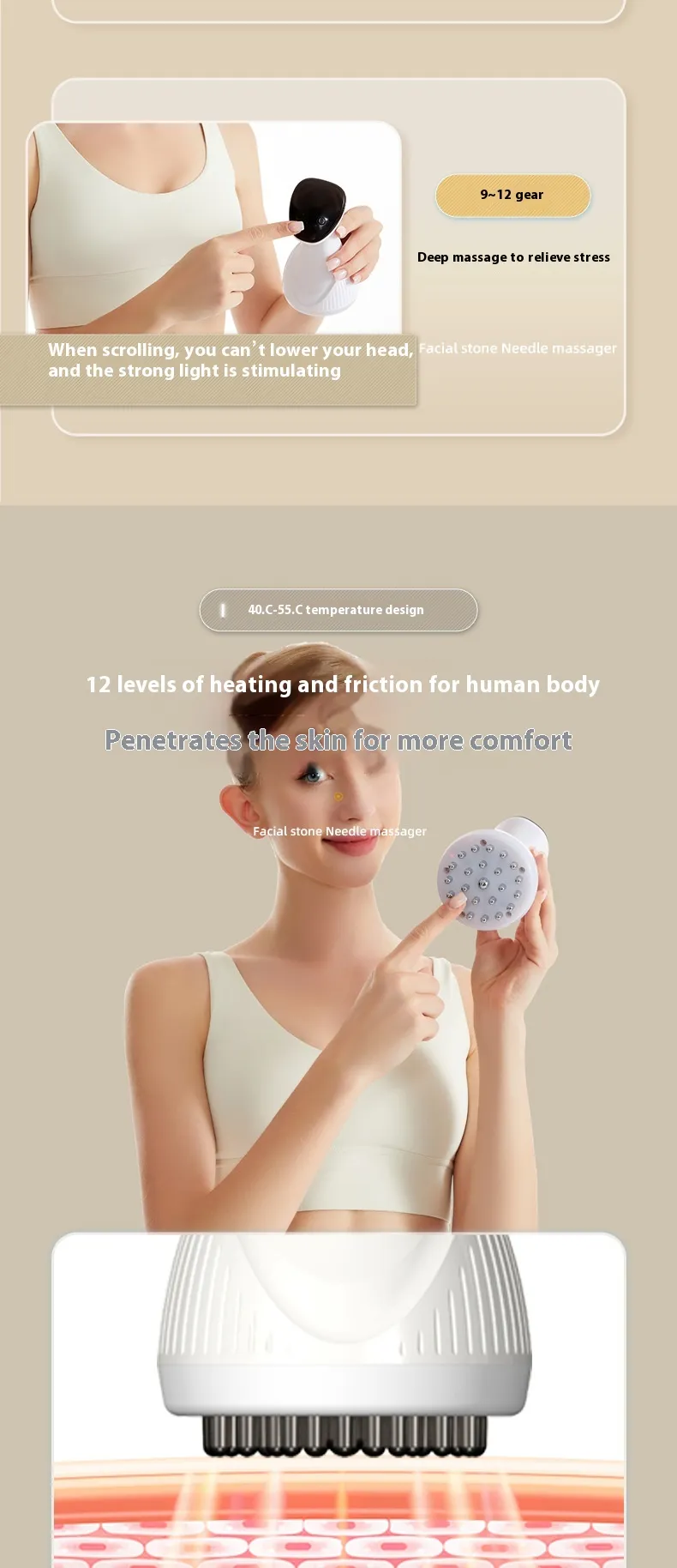 Stone Heating Technology: Utilizes heated stones to deliver deep, soothing warmth to specific areas of the body, mimicking