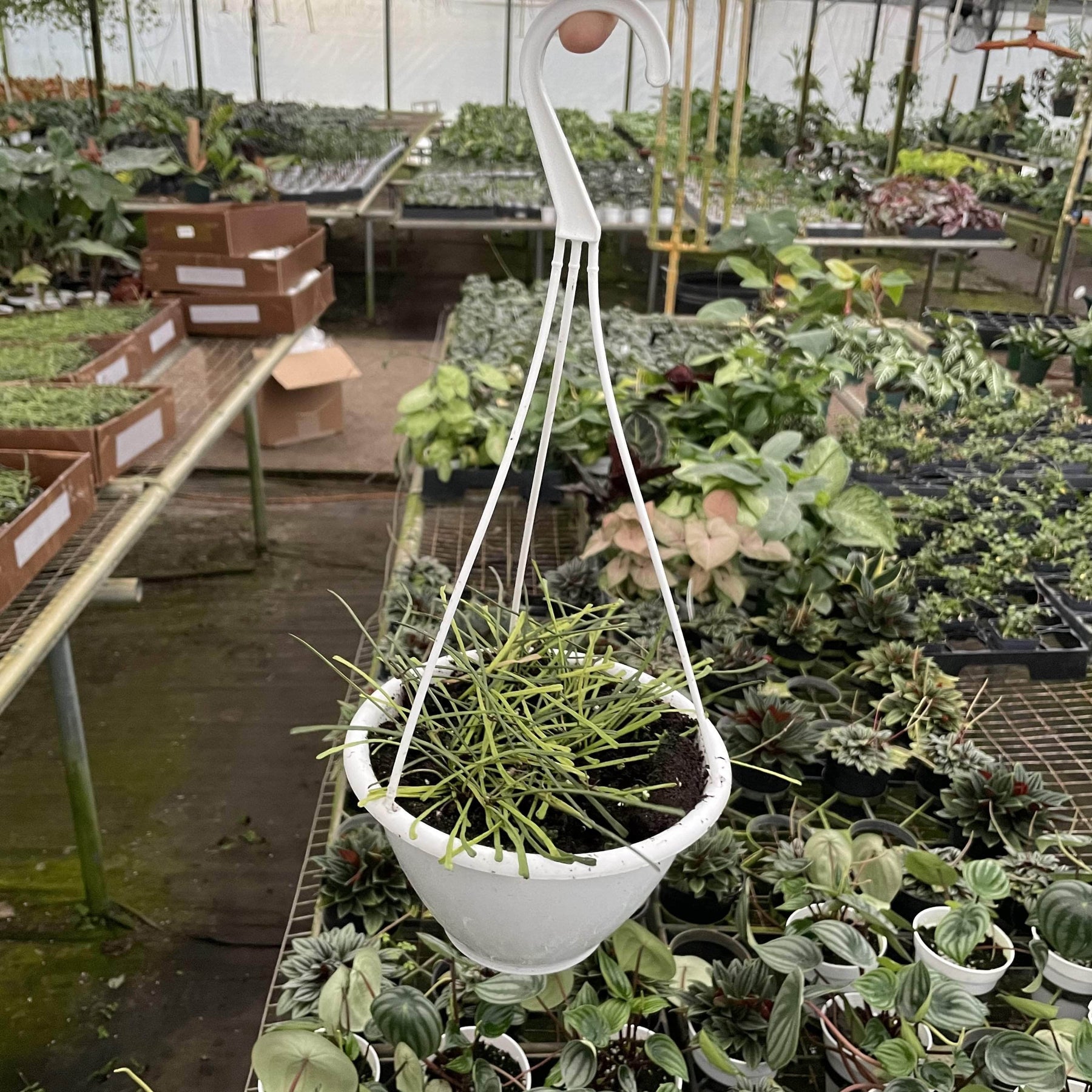 Hoya retusa features thin, grass-like leaves that are green and needle-like, giving the plant a delicate and airy appearance. The leaves are flat and linear, creating a unique texture and look that sets it apart from other Hoya varieties. One of the standout features of Hoya retusa is its small, star-shaped flowers. The flowers are typically white with a red center and emit a sweet, pleasant fragrance. These blooms are usually produced in the spring and summer, adding an extra layer of beauty and charm to the plant.