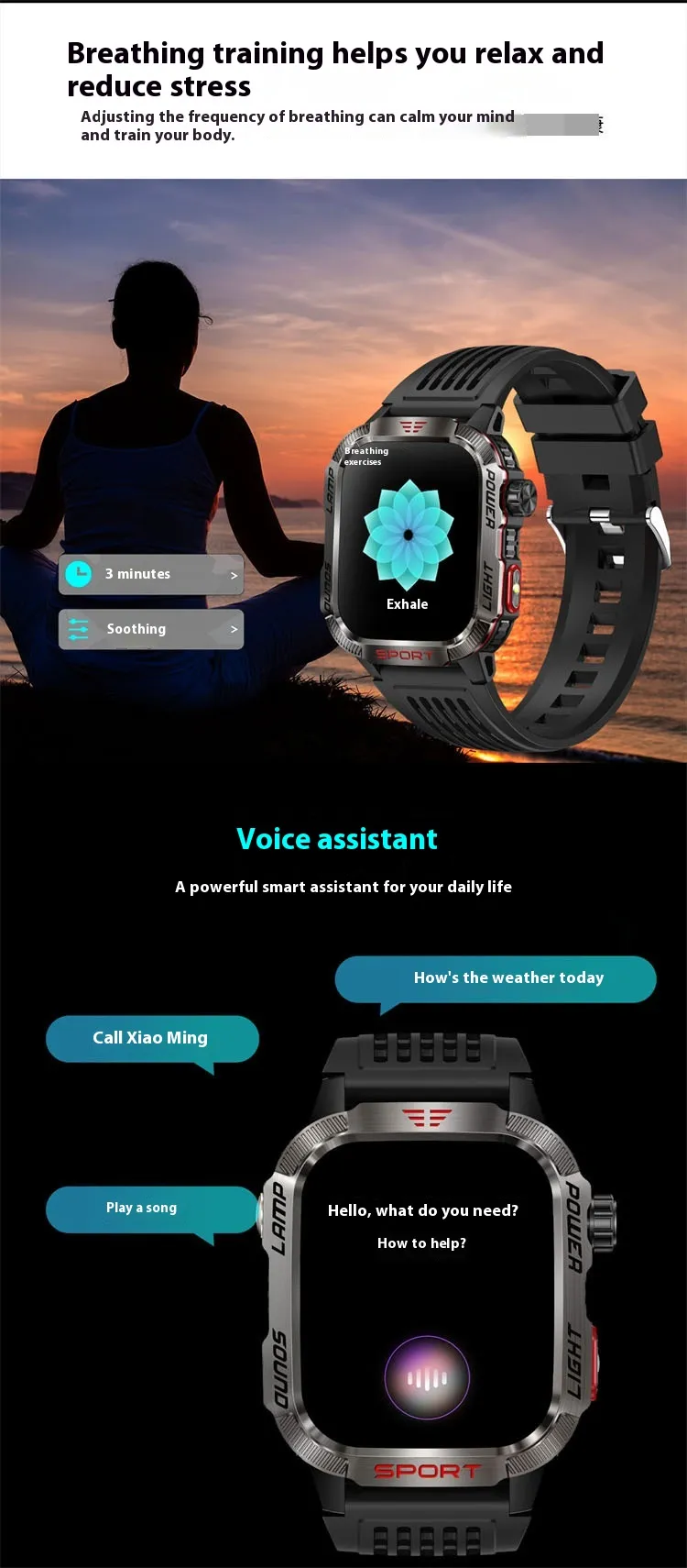 reminder, remote control selfie, sleep monitoring, blood oxygen detection