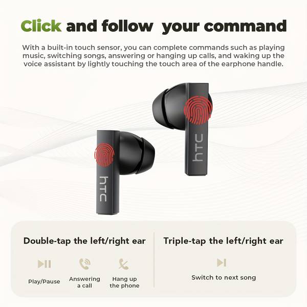 These earbuds use touch controls for easy navigation—play/pause, answer calls, change tracks, activate translation mode, and more. Designed with other wireless functions supplied by HTC, they ensure stable connectivity and reliable performance.