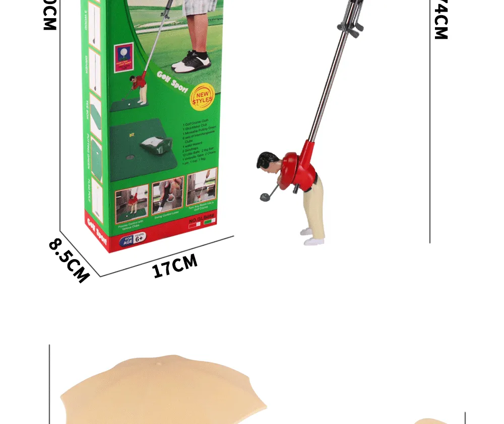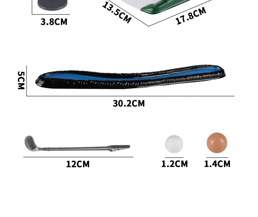 Accessories: a set of mini beach tables and chairs (two chairs, one table with an umbrella) in a bag, six golf pole heads, one set of hole flags, 12 foam white balls and two yellow plastic balls in a bag, two dune models, one river accessory, carpet 60x40CM, foot 25x15cm, one black handle, and a golf pole in a bag.