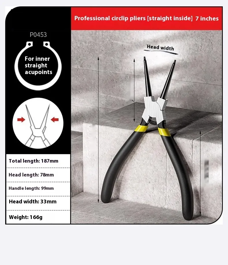 The Industrial Super Hard Circlip Pliers 7-inch Auto Repair Tools are designed for professionals who demand precision and durability in their automotive repair tasks. Crafted from high-quality, hardened steel, these 7-inch pliers offer exceptional strength and long-lasting performance, making them ideal for installing and removing circlips in automotive and industrial applications. Whether you're working on engines, machinery, or other mechanical projects, these pliers provide the reliability you need for precise, secure circlip manipulation.