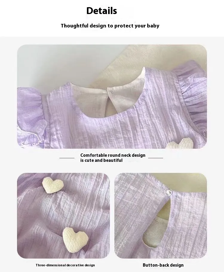 The romper is designed with an easy-to-use snap closure at the crotch, making it simple for parents to change diapers or get their baby dressed in no time. It’s practical and baby-friendly!