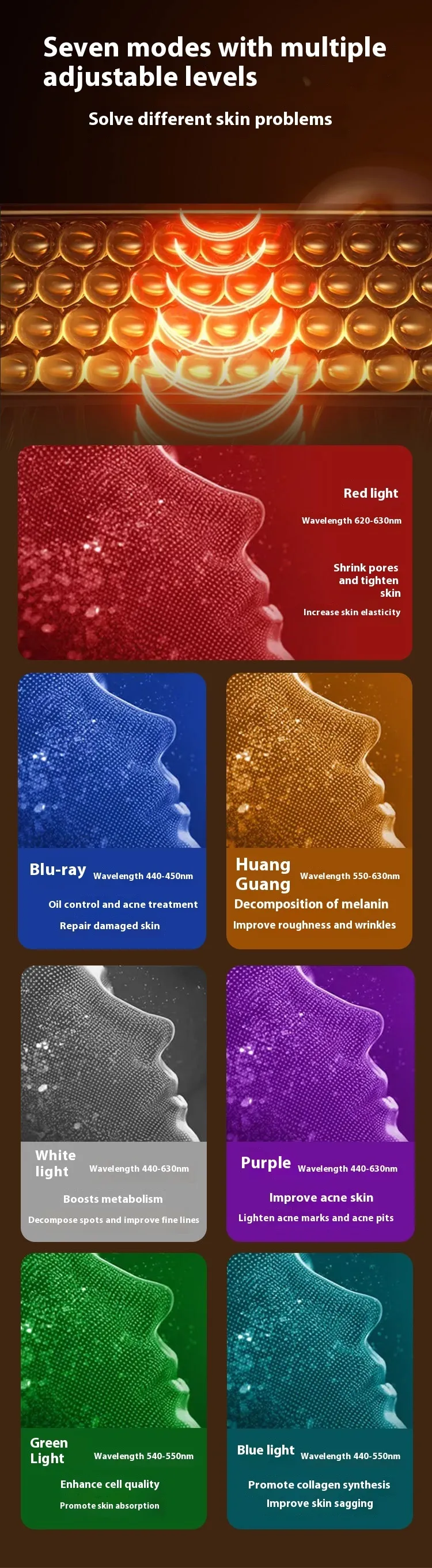 - Yellow Light: Improves blood circulation and reduces skin puffiness.