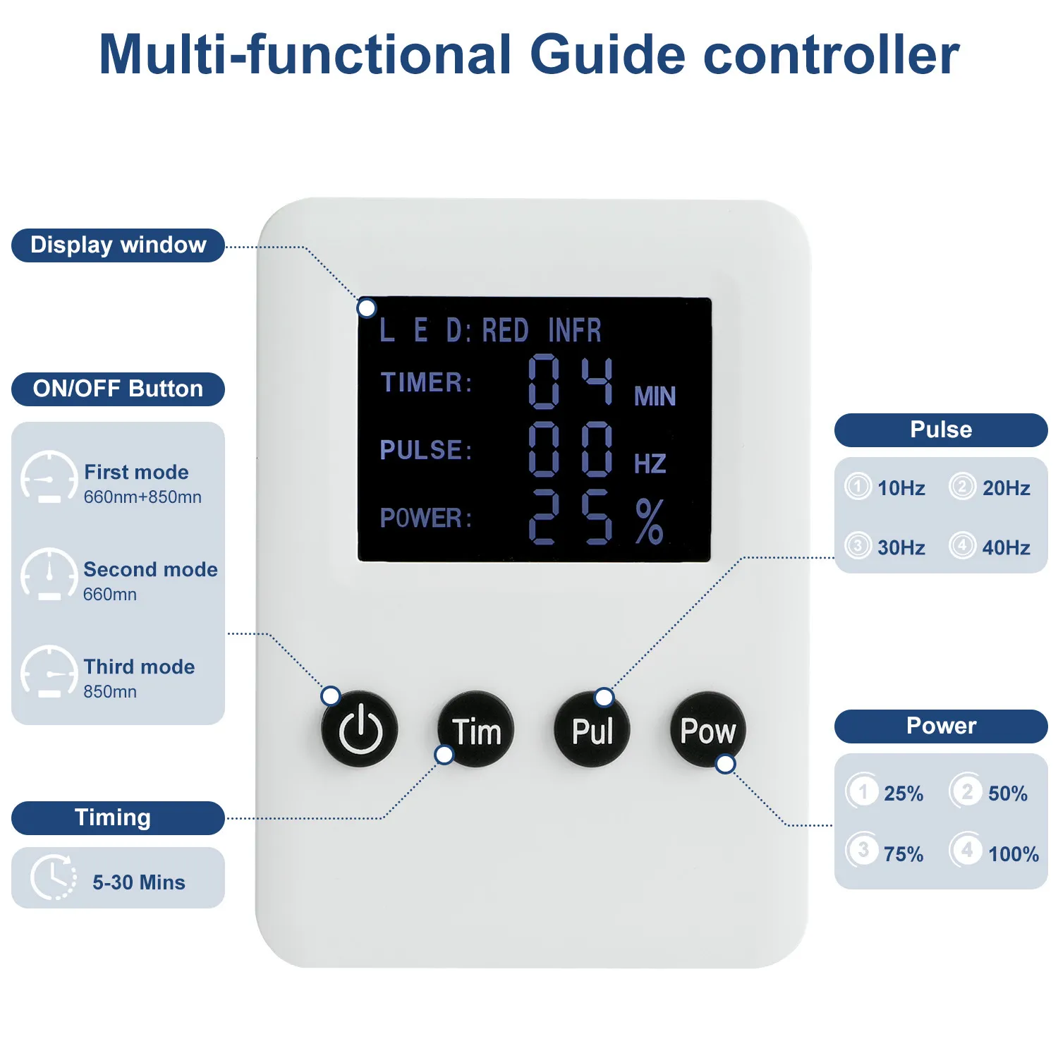 - Pulse 3 Mode:constant light, 10Hz pulse, and 40Hz pulse.Constant light mode improves blood circulation,Pulse modes,flashing 660nm red light and 850nm near-infrared light at 10 or 40 times per second,Pulse energy deeper into the cell tissue.