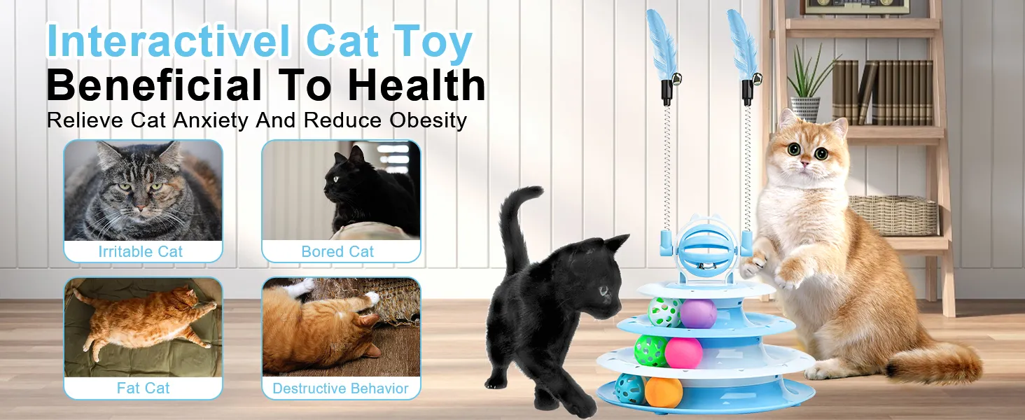 Multi-functional Fun:Interactive Cat Toys are designed with a 4-tier carousel with 6 toy balls, and the top features a bell ball with 2 teasing rods, a variety of ways to play to mobilize your cat's vitality and release an abundance of energy;