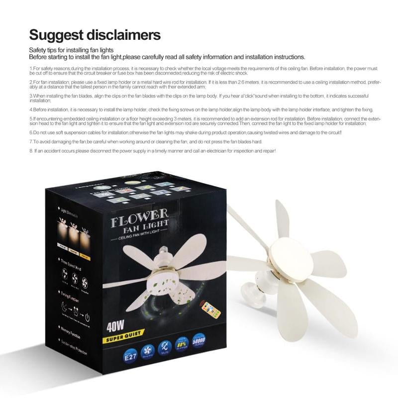 🌞New Flower-shaped Fan Lamp: 6 pieces blade with three speeds (240r/min 270r/min 300r/min).Plug-in fan blade design, safe, stable and easy to disassemble and clean, storage does not take up space, regardless of spring, summer, autumn and winter, it can be used is a lamp or a fan. And the fan light uses an E27 standard screw-in that can be easily installed on any 27 bulb base.