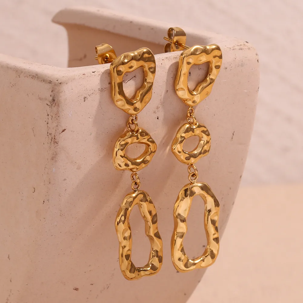 The standout feature of these earrings is their irregular beating pattern that adds texture and dimension to the geometric hollow-out shape. This creative combination makes them not just earrings, but pieces of art that draw attention.