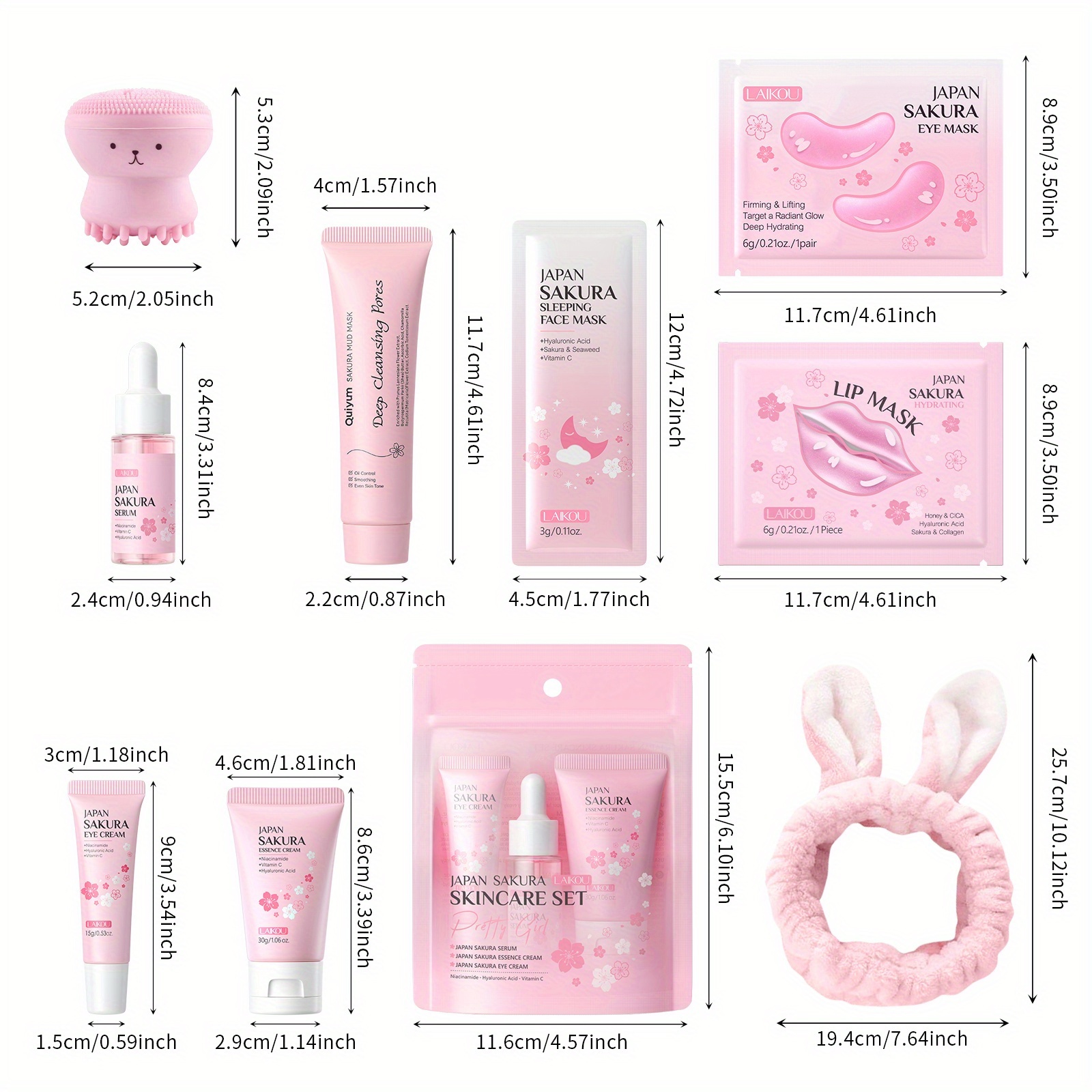 The Japan Sakura Skincare Care Set includes everything you need for glowing, youthful skin. This comprehensive set contains a range of products, including lip masks, eye masks, sleeping face masks, and a full skincare routine featuring serums, creams, and more.