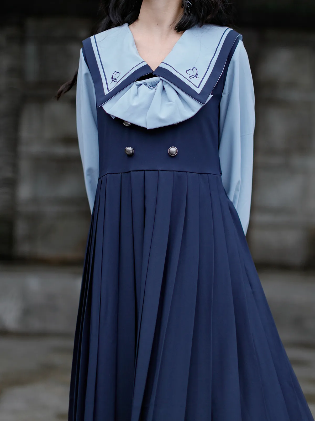 The standout feature of the Japanese Navy Neck Embroidered Dark Blue Preppy Dress is the exquisite embroidery detailing around the neckline. The intricate design is inspired by Japanese artistry, featuring delicate floral patterns that add a refined and artistic touch to the dress. This embroidery not only elevates the overall look of the dress but also imbues it with a sense of tradition and grace, blending perfectly with the modern preppy style.