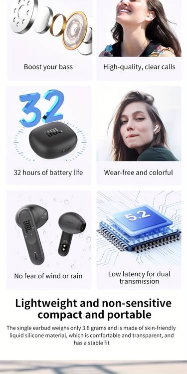 Powered by wireless Bluetooth functionality, the earphones provide stable audio transmission for music, calls, videos, and games. Whether paired with your smartphone or tablet, they deliver JBL’s signature balanced sound with clean vocals, punchy lows, and detailed mid-range tones.