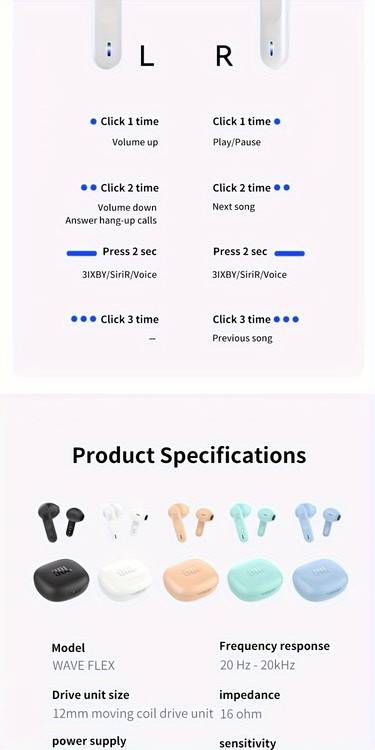 The JBL WAVE FLEX earphones are engineered for everyday comfort and high-quality wireless performance. Featuring a semi-in-ear structure, they rest gently at the ear opening rather than pressing deeply into the ear canal. This design offers better airflow, less pressure, and all-day wearability — perfect for users who prefer a comfortable, open feel without sacrificing sound quality.