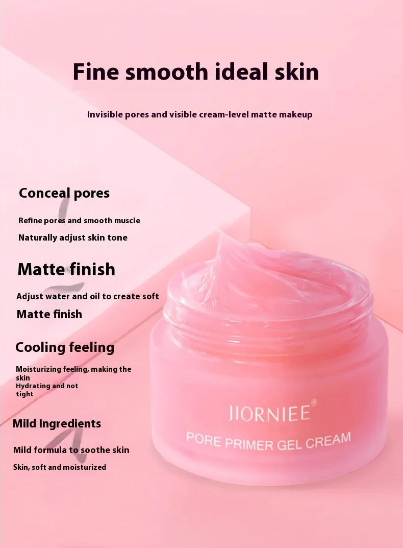 Achieve a smooth, matte finish with Jiornee Pore Primer Gel Cream. Conceal pores, balance oil and hydration, and prepare your skin for makeup with this gentle, effective primer.