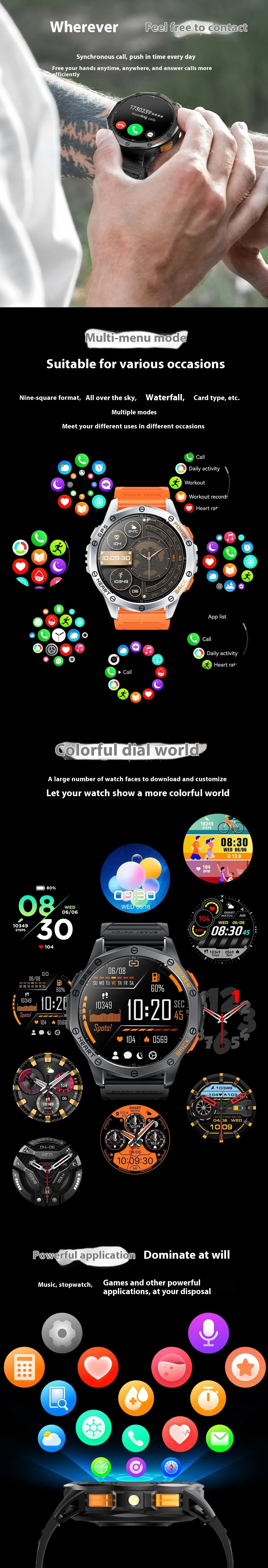 Function list: Metal body, dustproof, drop resistant, replaceable strap, deep waterproof, AMOLED full touch high-definition display screen,