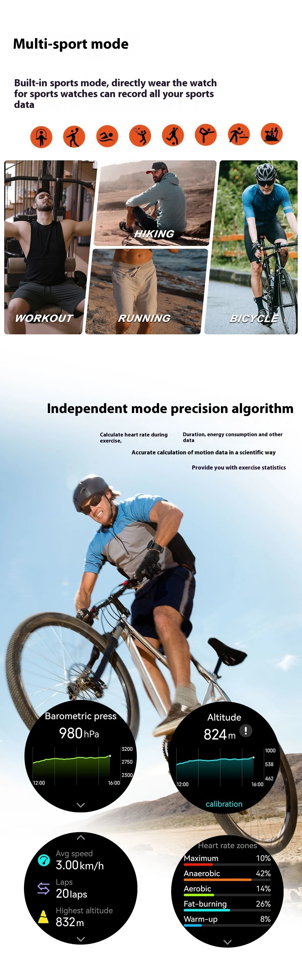 large capacity high-voltage pure cobalt battery, high-precision positioning GPS, multiple sensors, 170+sports modes, supports heart rate,
