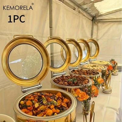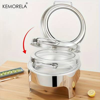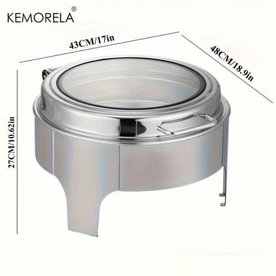 The KEMORELA Round Hot Pot Buffet Set is a luxury-style 304L stainless steel chafing dish designed for hot food serving, catering events, wedding receptions, buffet tables, and home entertaining. Featuring a clear glass window hydraulic lid, this food warmer allows guests to see dishes without lifting the lid, helping maintain heat and cleanliness.