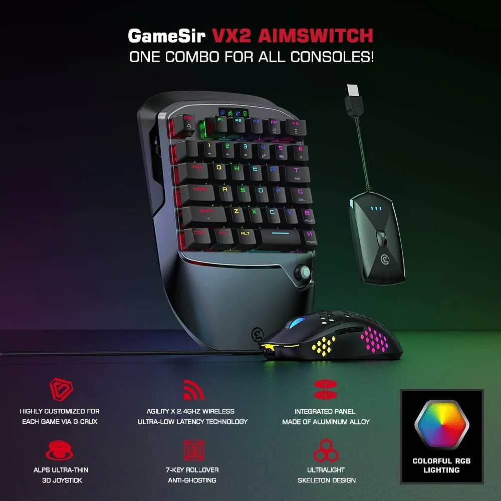 The tech changes the way we play console games. GameSir VX2 AimSwitch supports almost all consoles. It’s compatible with Xbox One, Xbox One S, Xbox One X, PS4, PS4 Slim, PS4 Pro, Nintendo Switch and Windows PC. GameSir VX2 AimSwitch can be widely used on different consoles.