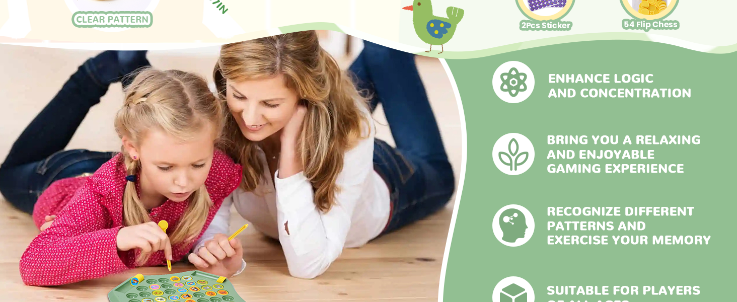 - 🥭【Game Rules】Flip chess memory game means that two people flip the chess pieces, take turns flipping the chess pieces, and put the chess pieces back into the empty slot after each flip of the same pattern, which helps to train the player's memory.