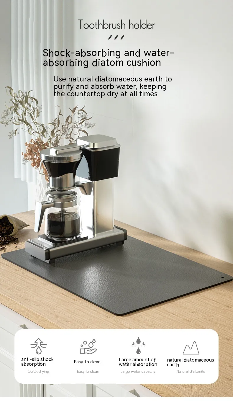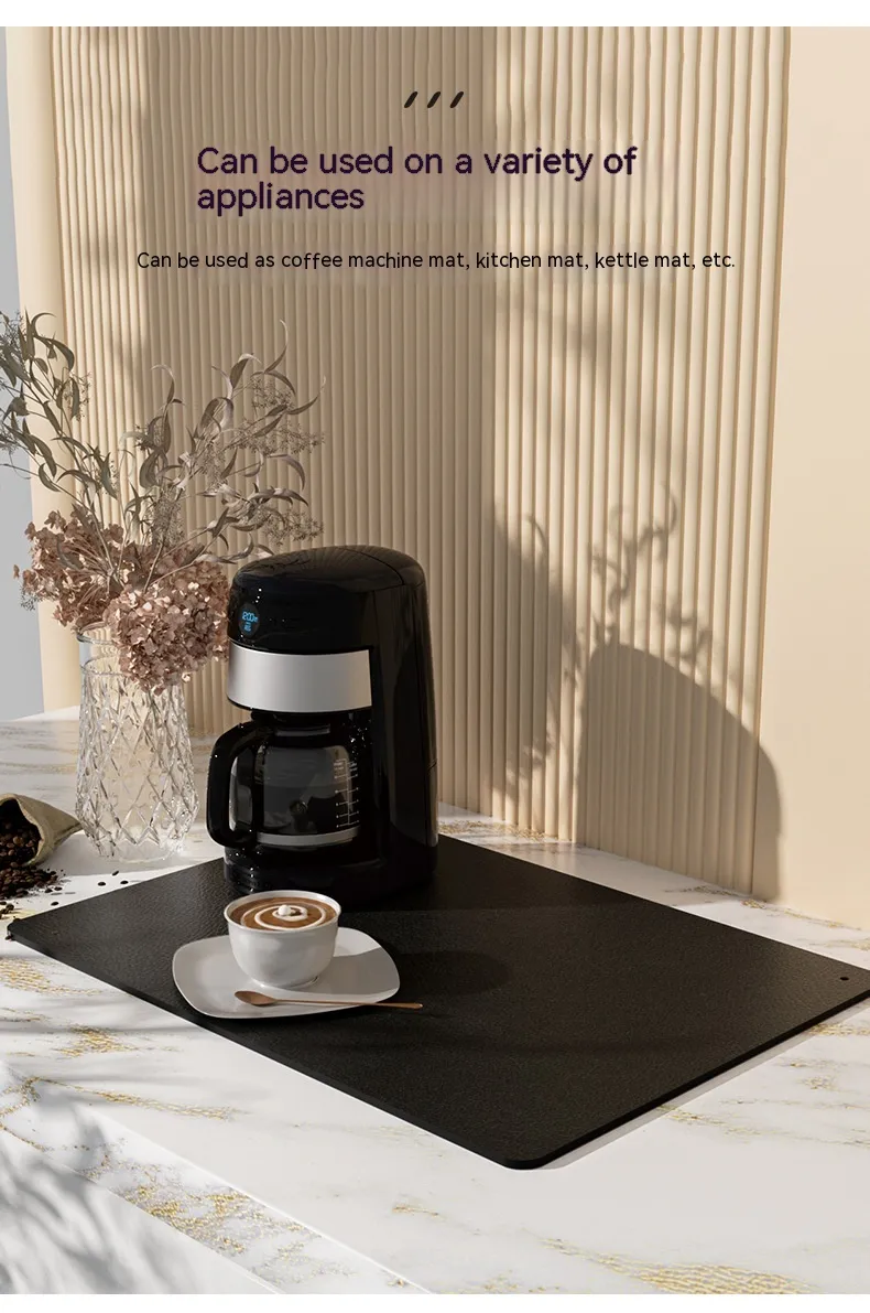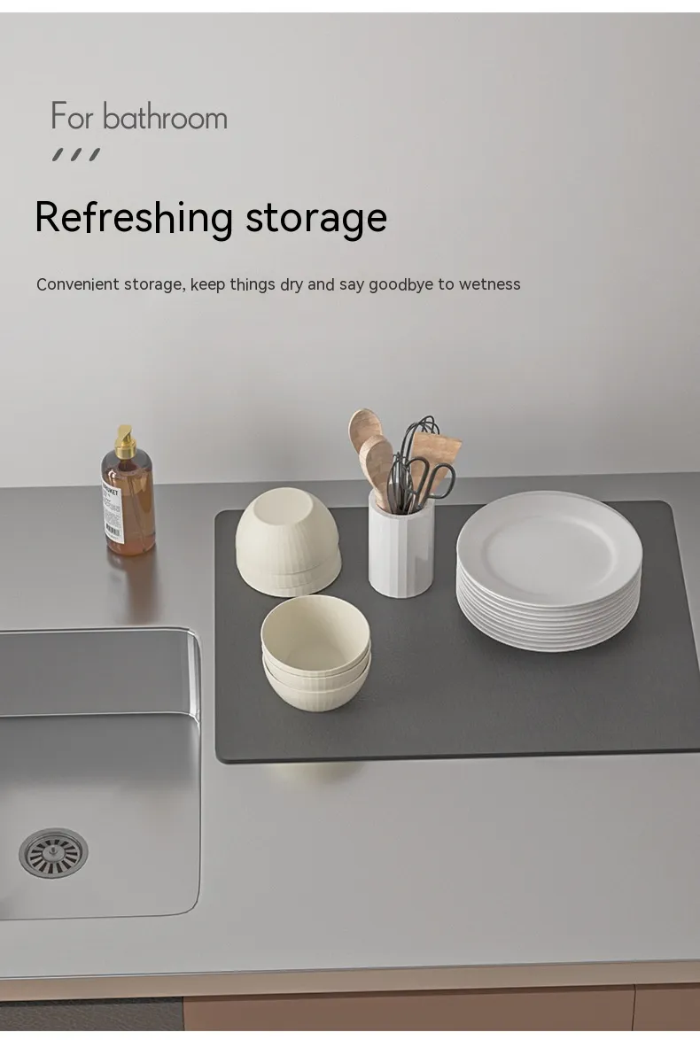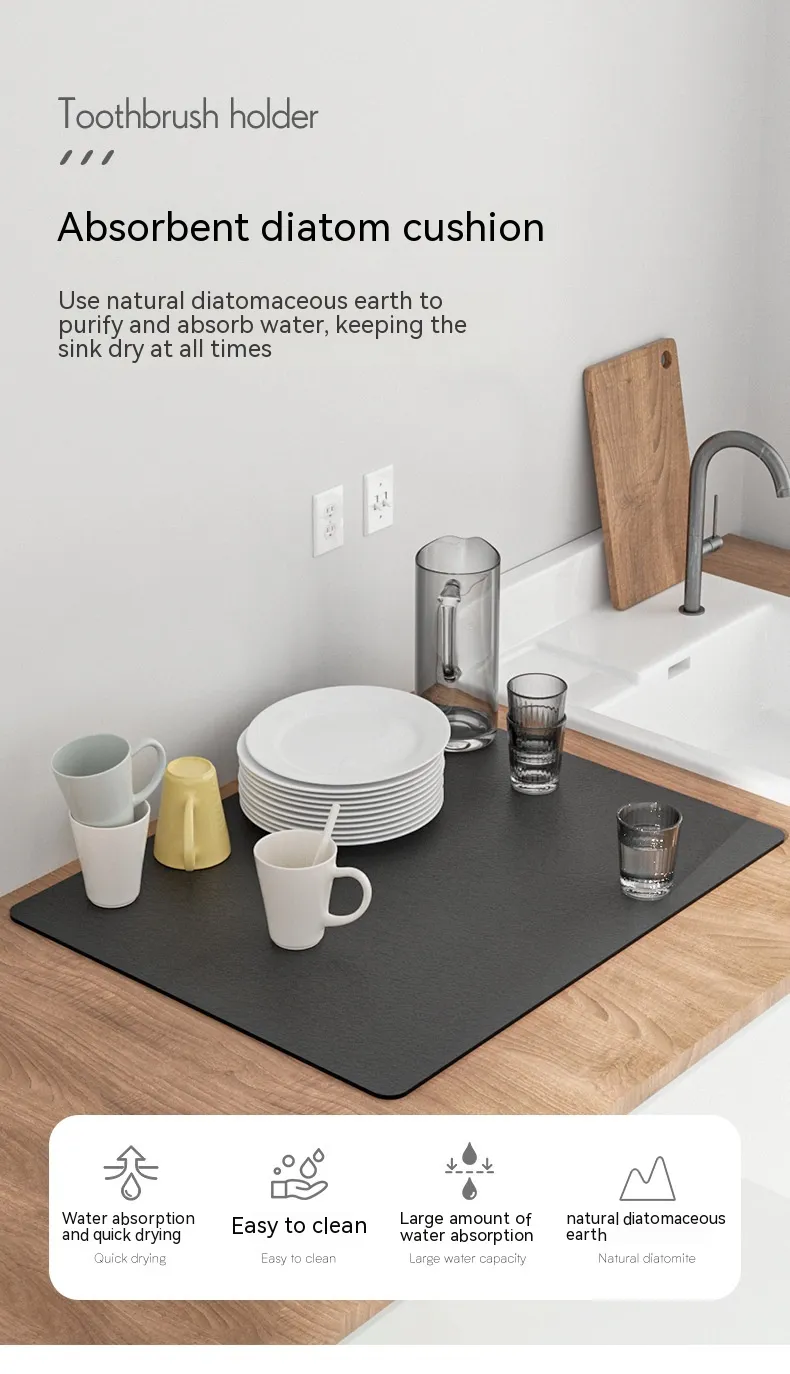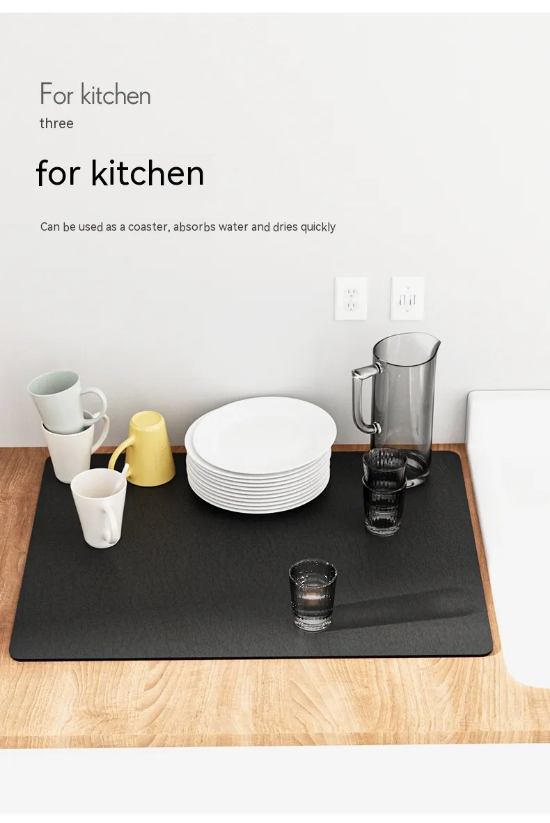 The Kitchen Countertop Drain Mat is crafted from high-quality, absorbent materials that efficiently trap water and moisture while your dishes dry. Featuring a sleek, functional design, this mat is designed to fit neatly next to your sink, providing a designated area for dish drying. The material allows water to drain away from your dishes, preventing water from pooling and keeping your countertops dry.