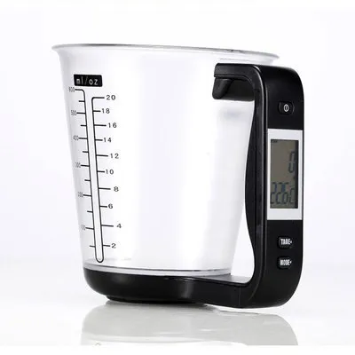The Kitchen Electronic Measuring Cup integrates a measuring cup and digital scale, providing dual functionality in one compact device.