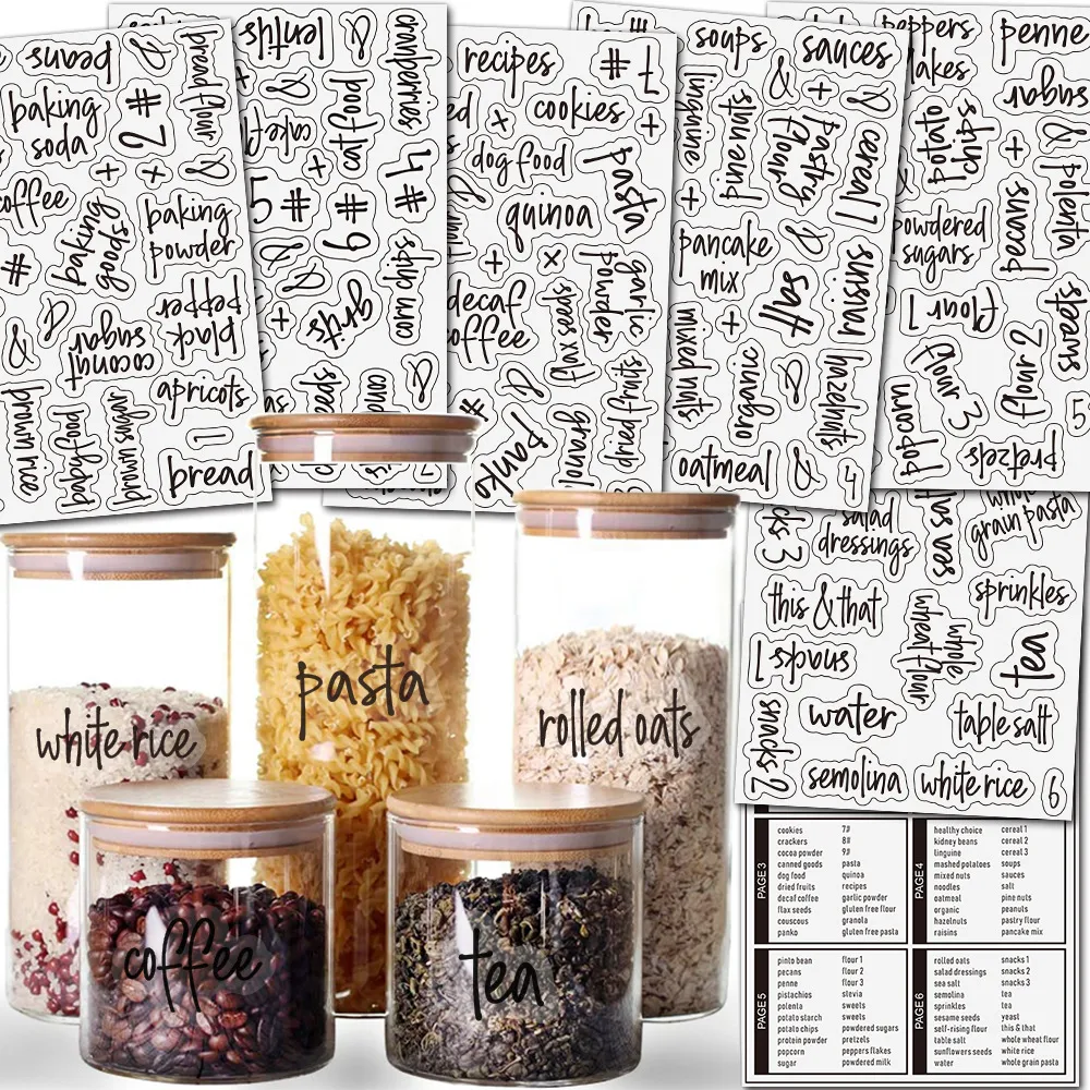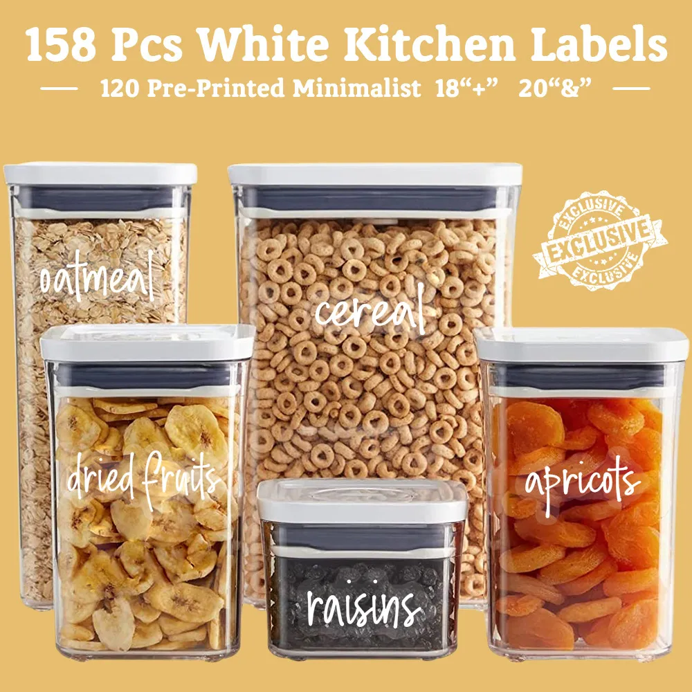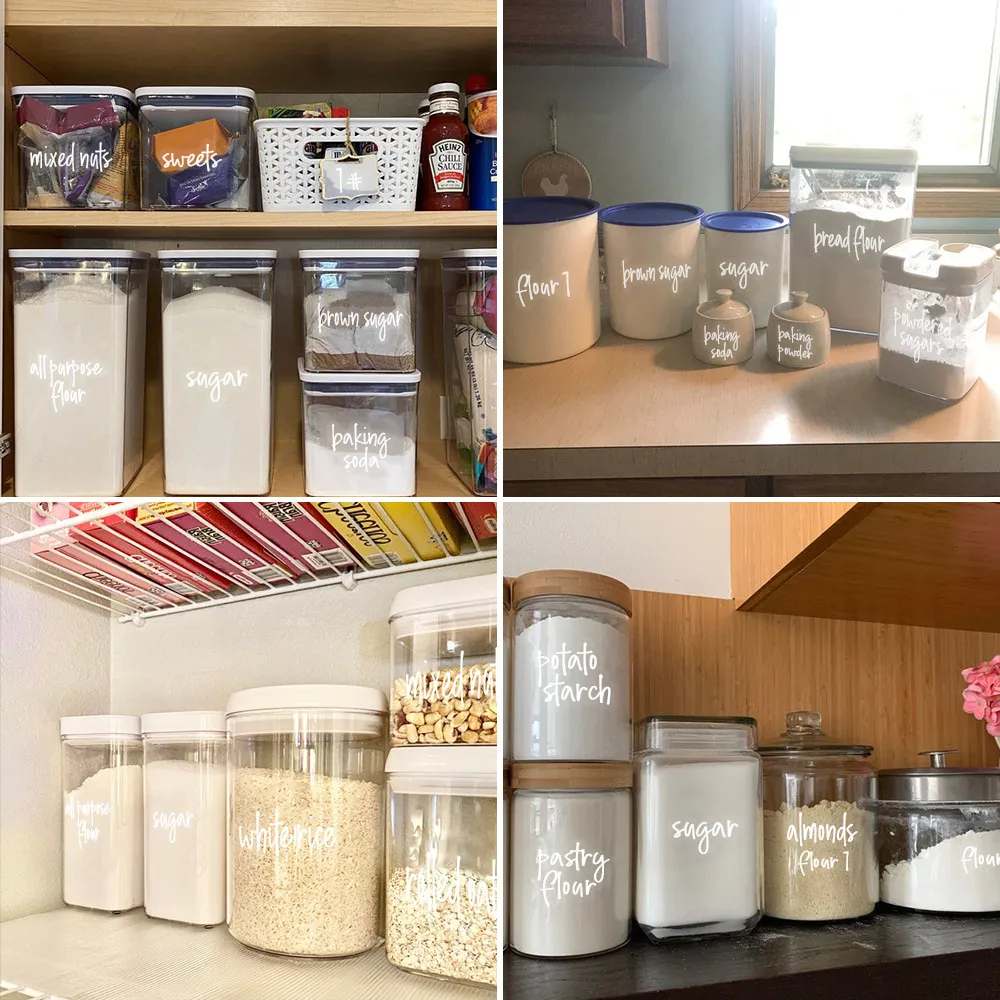- Picture Perfect Organization: Use these preprinted food storage labels on jars, containers, baskets, or any storage solution you have in your kitchen or pantry. These comprehensive water-resistant white canister labels help keep all your pantry essentials neatly and uniformly labeled for quick recognition and picture perfect organization