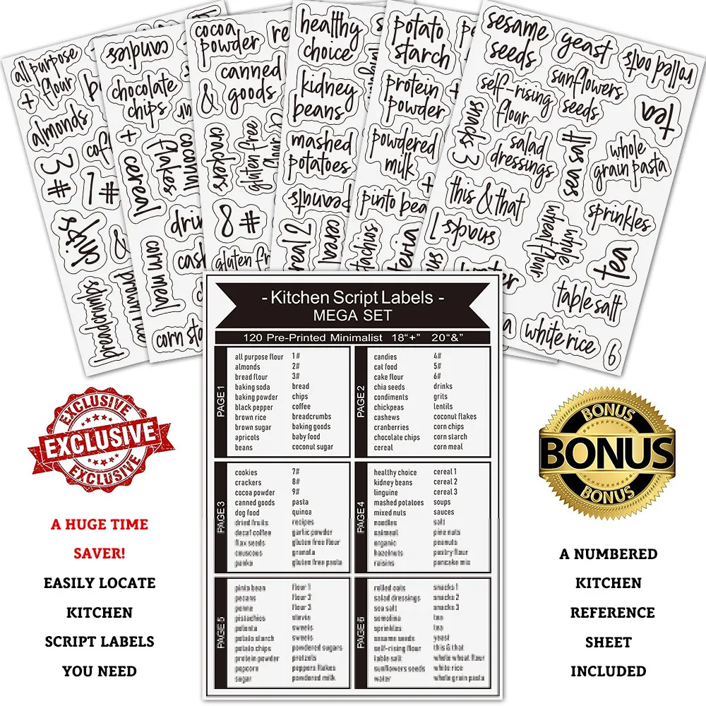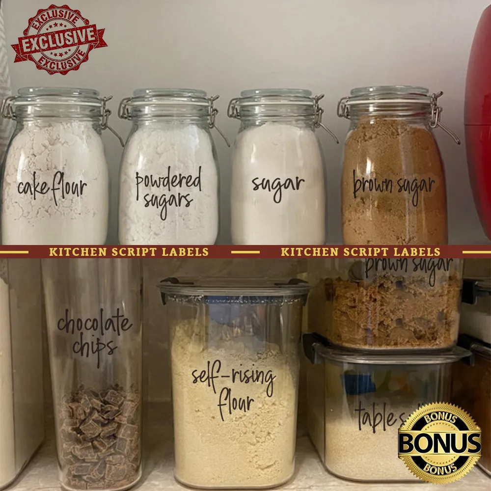 - Beautiful Script Font & Thoughtful Design: These kitchen pantry labels feature a sleek and contemporary white script font on a clear background and include a self-adhesive backing. Simply peel and stick these pantry sticker labels on your vessel of choice and you're on your way to a more organized kitchen pantry without the worry of the labels peeling off