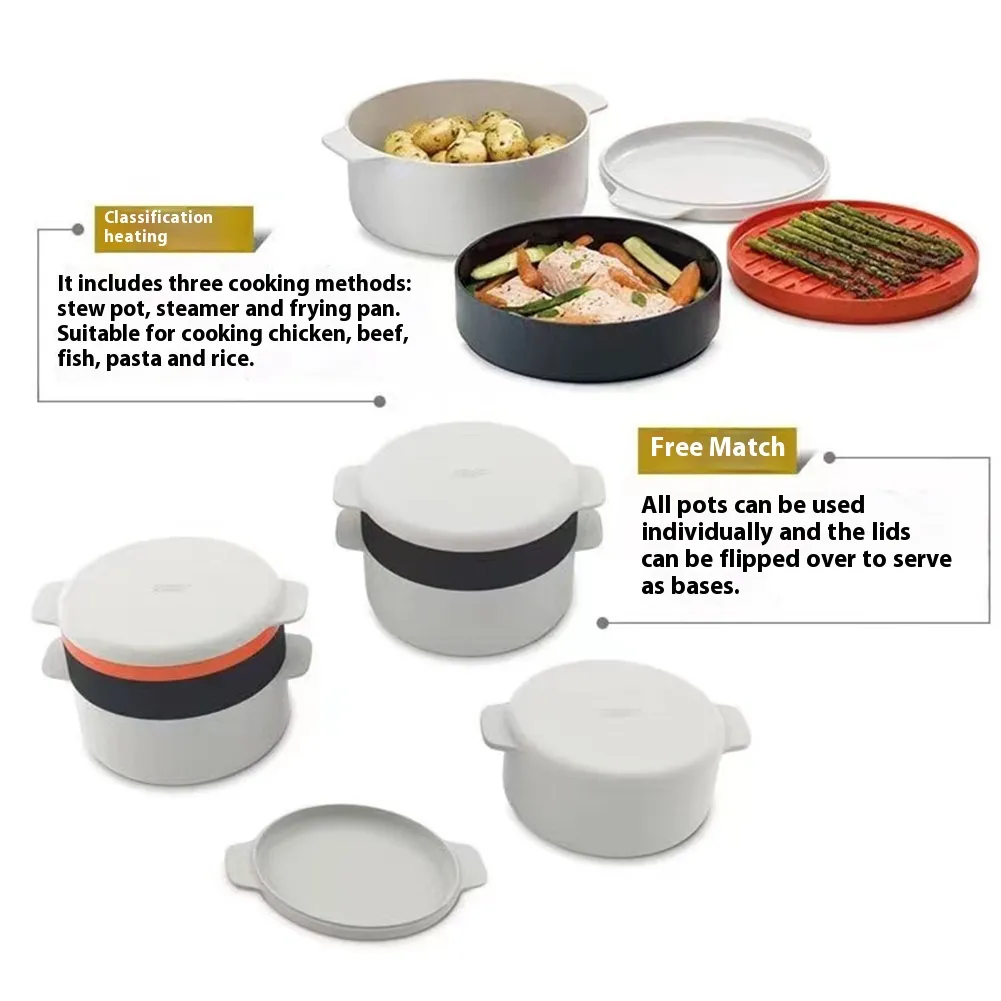 The design of stacked cookware allows you to cook various ingredients simultaneously.