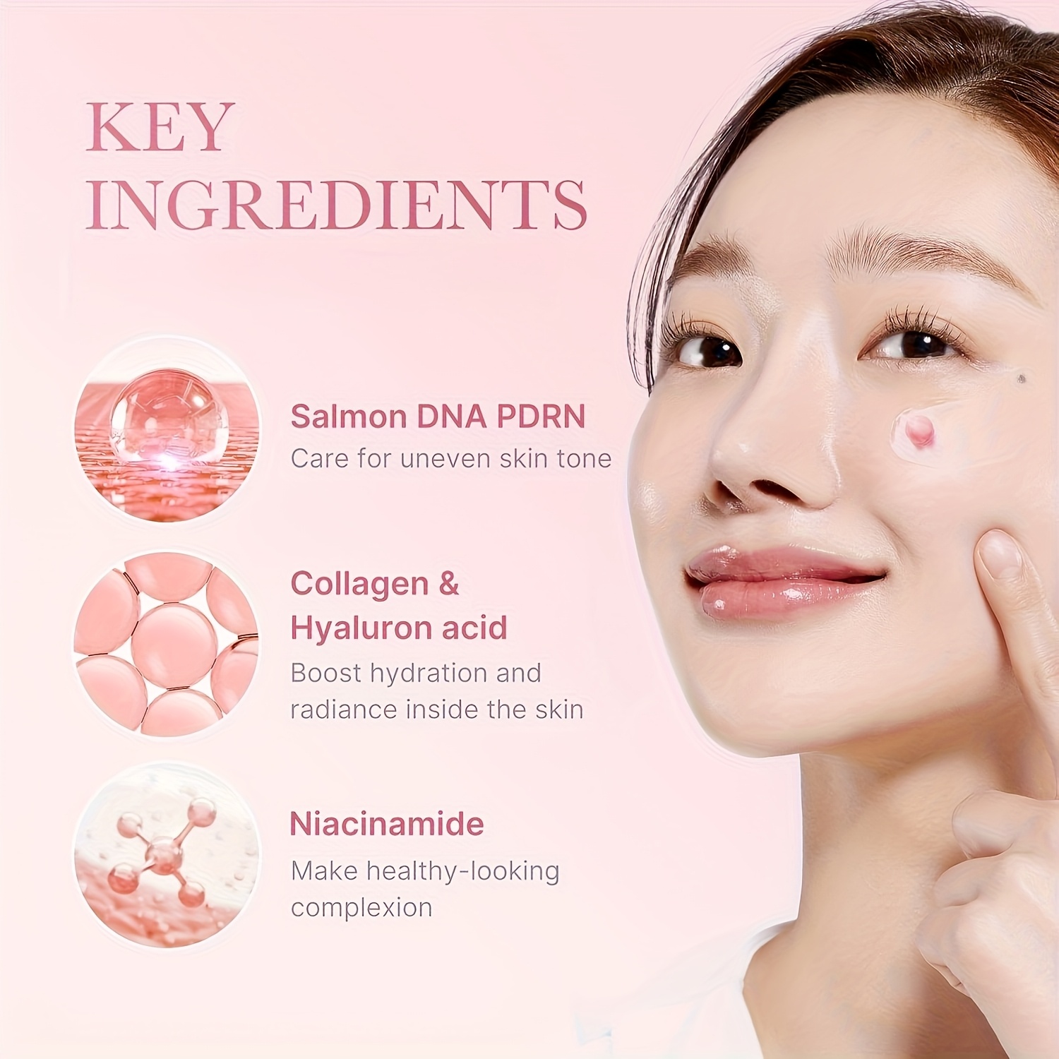 The PDRN Pink Collagen Capsule Cream features a distinctive capsule texture suspended in a hydrating gel-cream base. Upon application, the capsules melt into the skin, releasing collagen-rich actives that help support elasticity and moisture retention. This design ensures even distribution and fresh activation with every use, leaving the skin feeling plump, smooth, and nourished without heaviness.