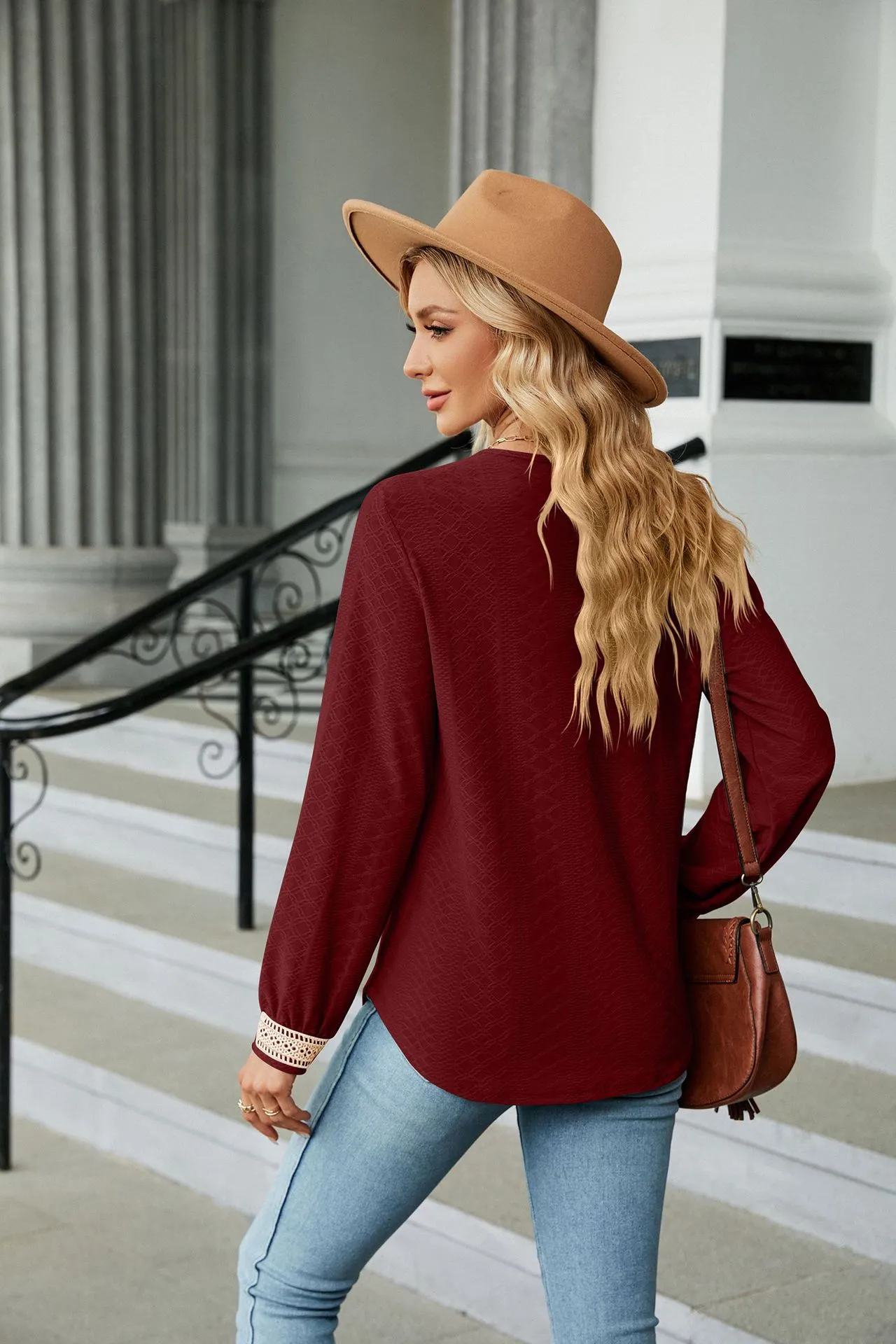 Lace Stitching V-neck T-shirt Loose Long-sleeved Solid Color Top For Women