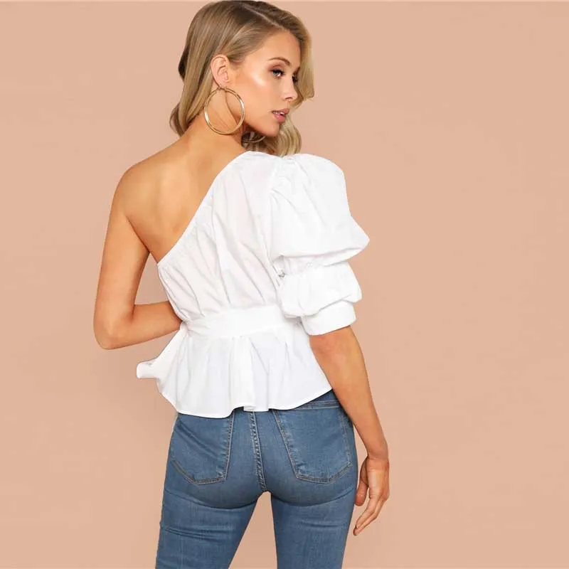 Lace-up mid-sleeve lantern sleeves right off-the-shoulder diagonal collar slim top