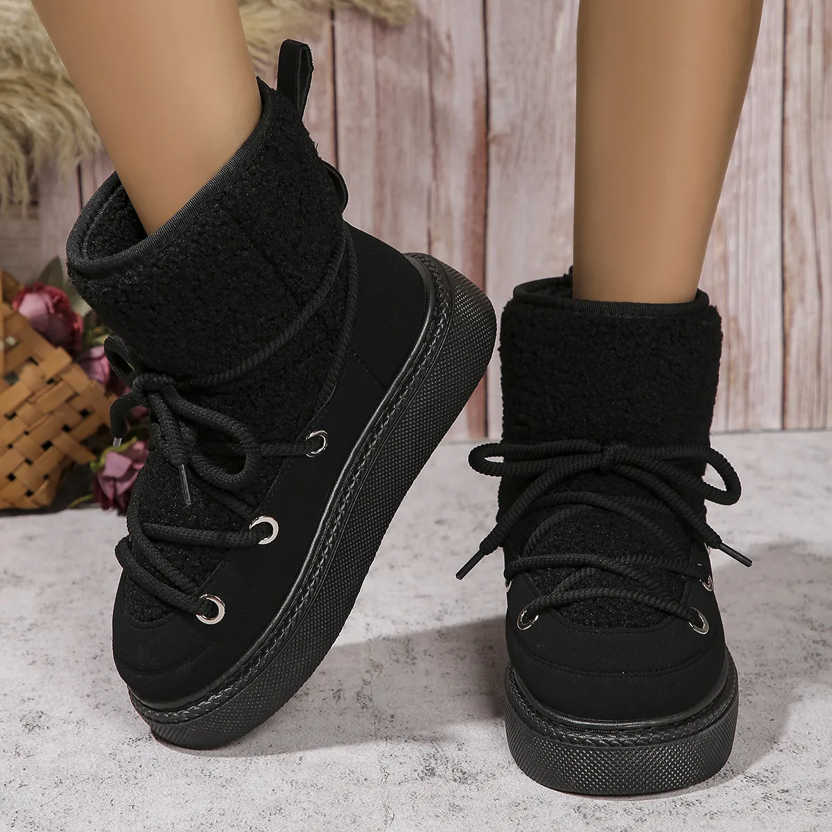 The Fashion Lace-up Snow Boots are designed for women seeking both style and functionality in winter. These boots feature a thick sole for height enhancement and comfort.