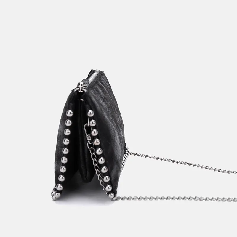 At the heart of this handbag’s appeal is its intricate hand-beaded black surface, which glimmers subtly in the light. The pattern adds texture and visual intrigue, transforming a compact bag into a bold fashion statement.