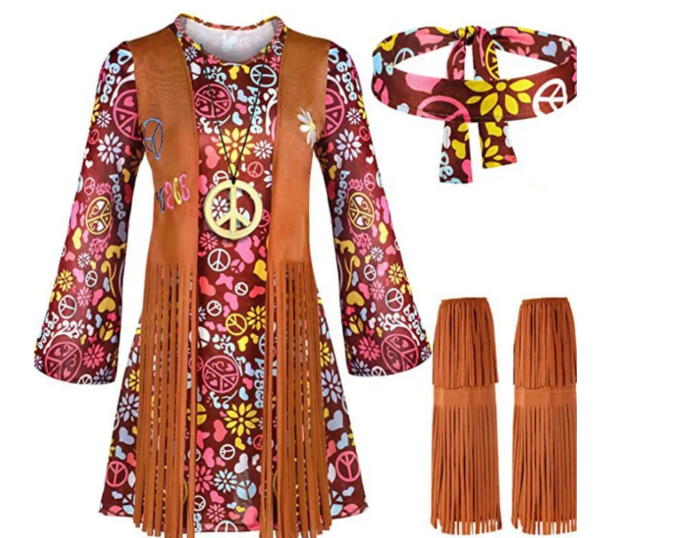 like headbands or peace sign necklaces. Everything you need to complete your look is included in one set.