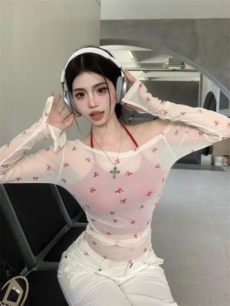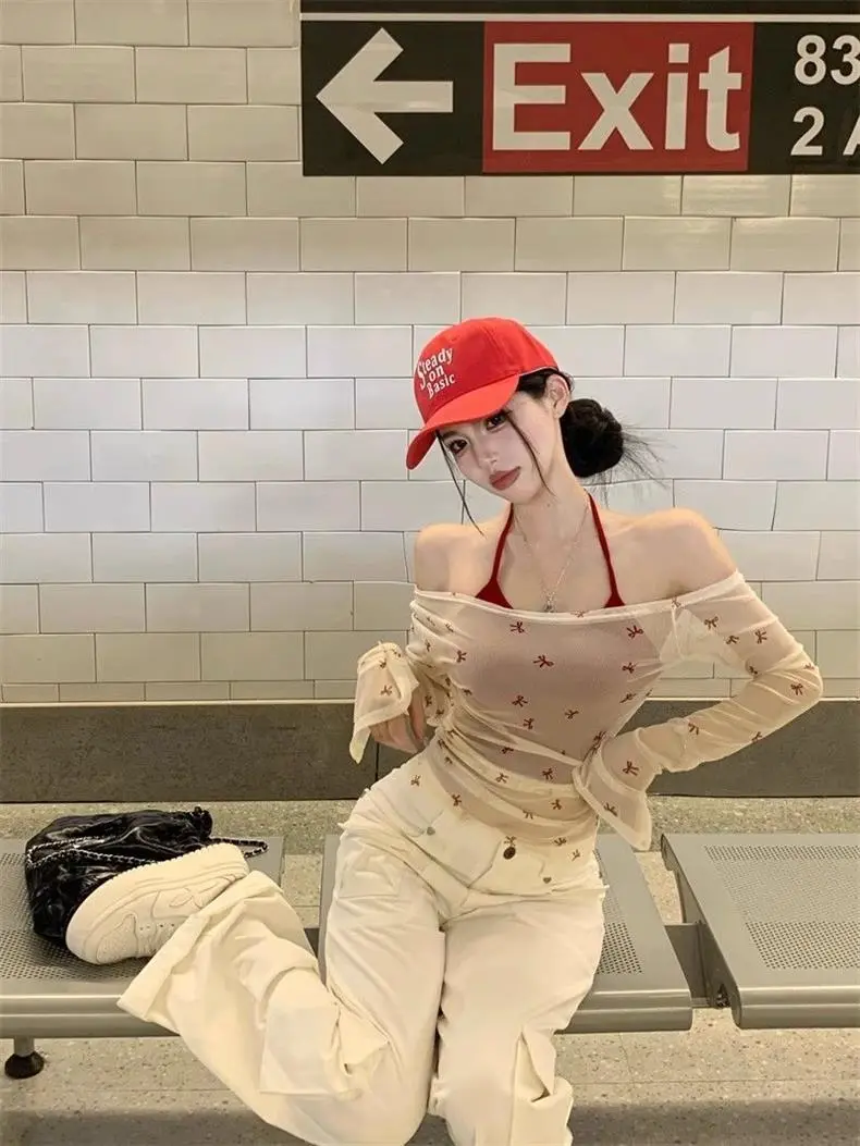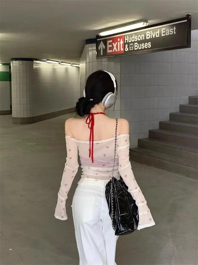 Chic and Stylish Ladies' Mesh Blouse Slim-fit Off-shoulder Top