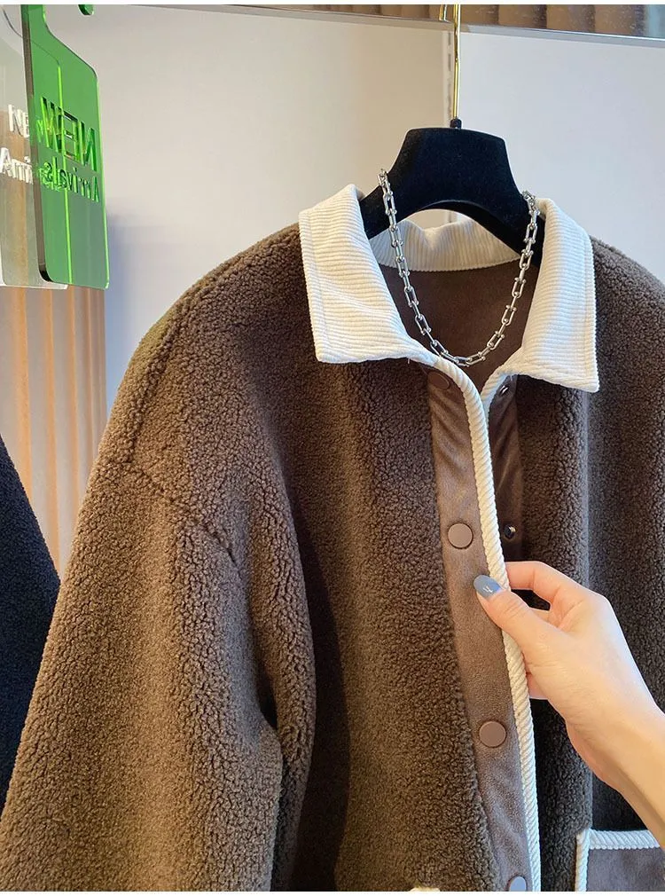 lamb wool coat, plus size winter coat, slimming winter coat, thickened warm coat, women’s plus size coat, stylish wool coat, loose fit winter coat, splicing winter coat, warm winter outerwear, plus size wool coat, women’s winter fashion