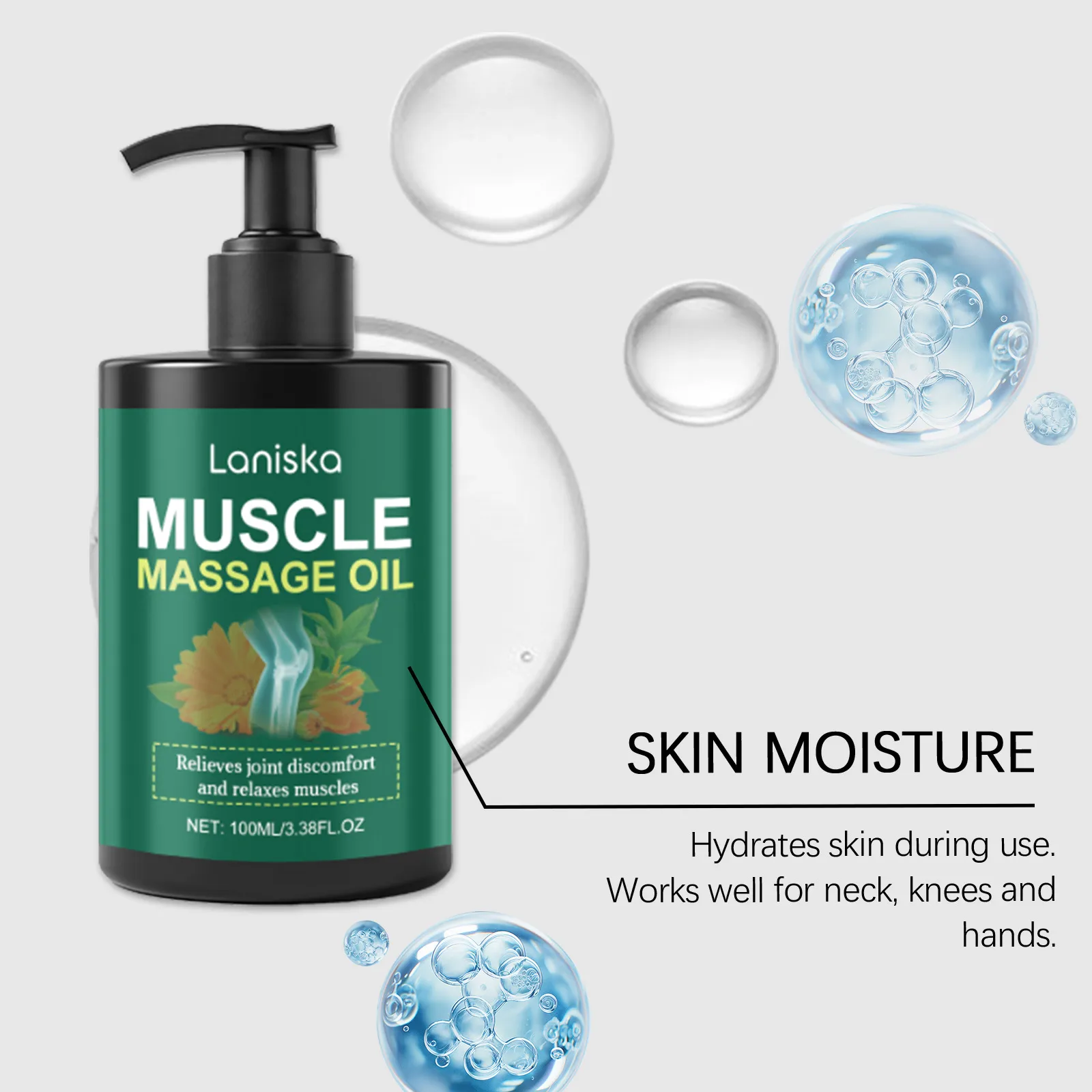 Laniska Muscle Massage Oil – Relieves muscle discomfort, hydrates skin, and soothes joints. Perfect for neck, knees, and hands for a relaxing massage.