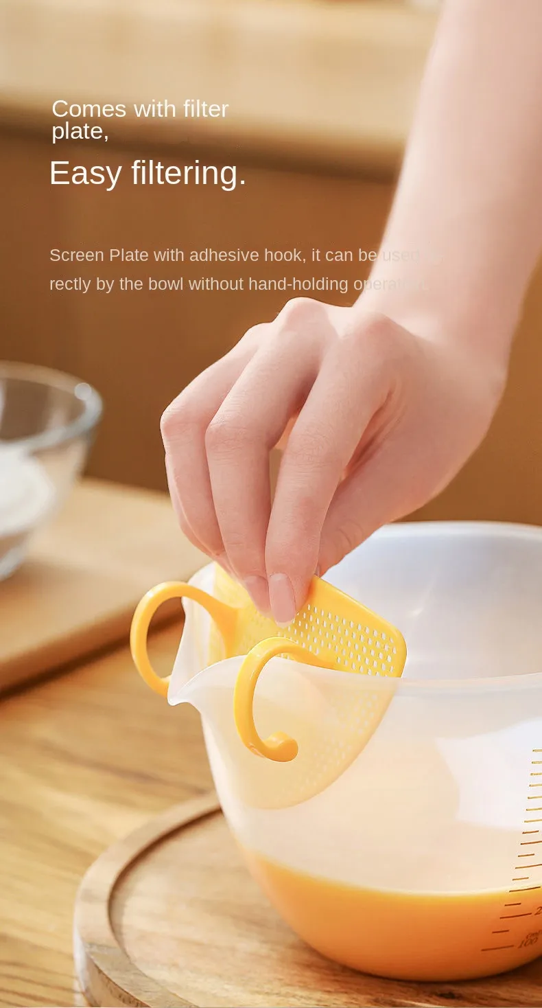 Functions as a mixing bowl, measuring cup, and egg filter, providing versatility for a wide range of kitchen tasks.