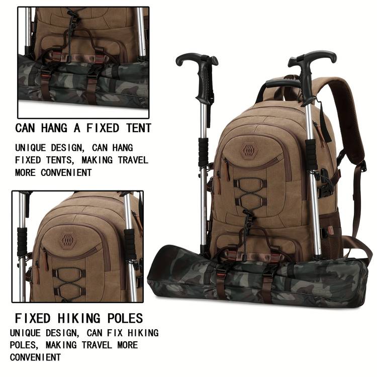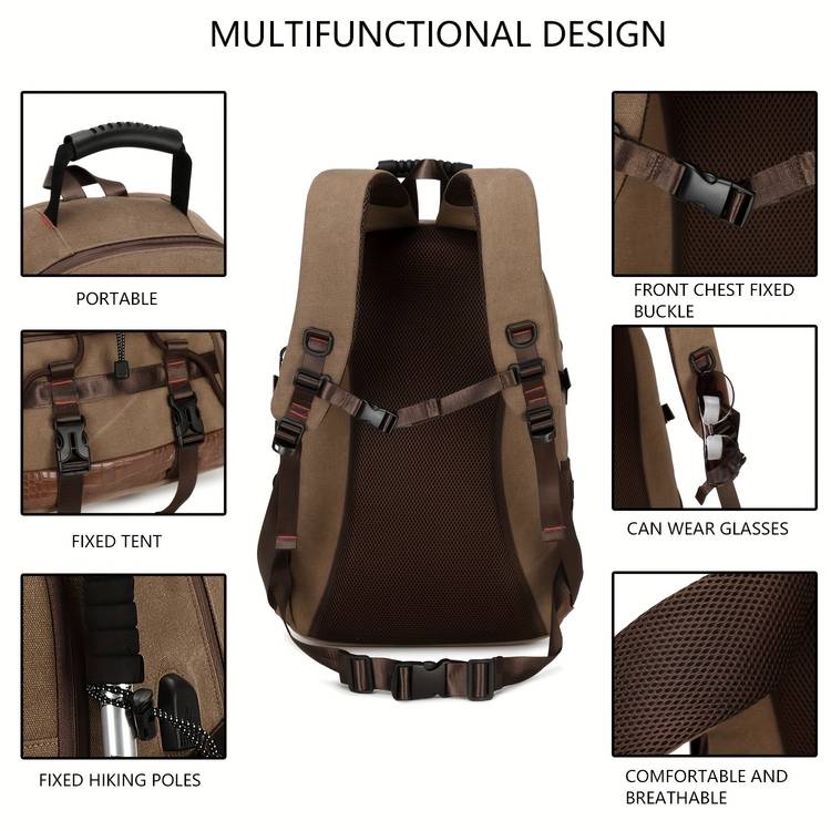 Crafted from durable canvas, the Large Capacity Hiking Backpack offers plenty of storage space for all your gear, making it ideal for outdoor adventures and travel. The bag features a spacious main compartment with multiple smaller compartments to help you organize your gear. Whether you're carrying hiking equipment, clothes, or a laptop, this backpack ensures everything stays secure and organized.