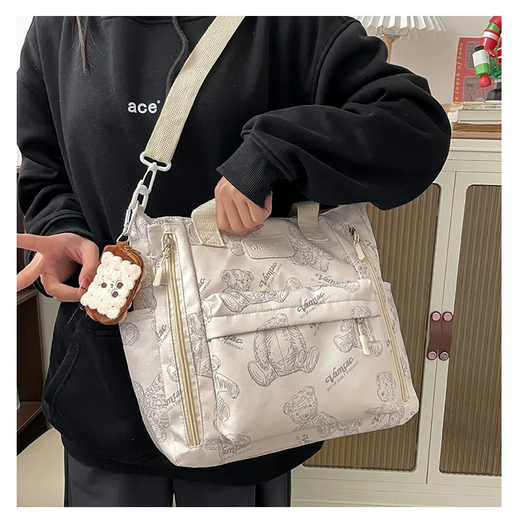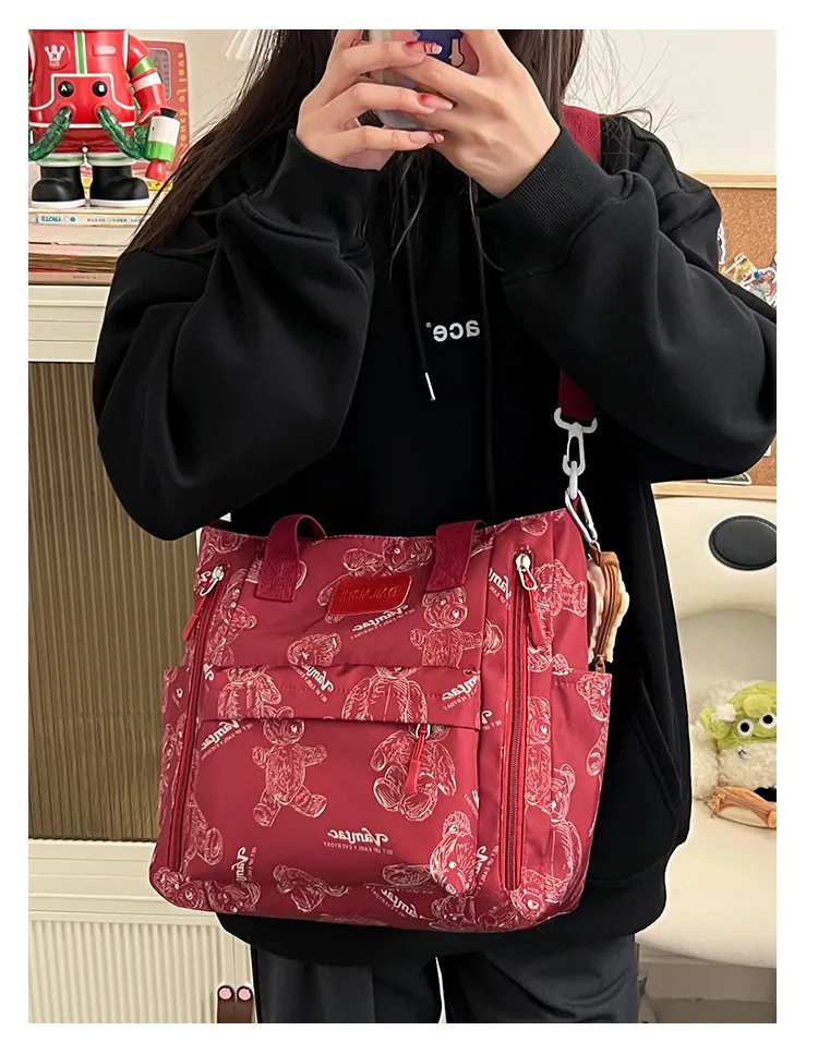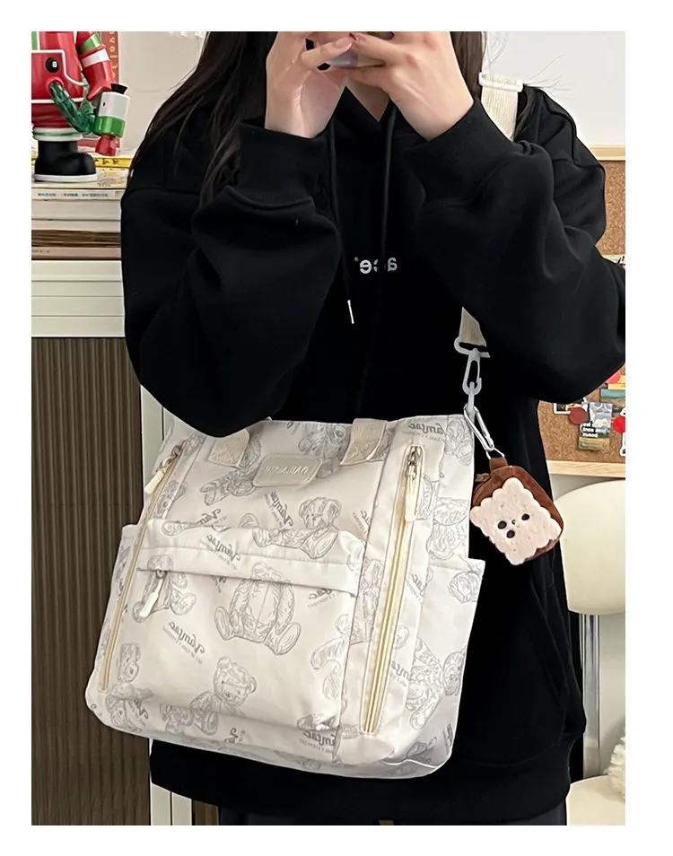 This tote bag is adorned with a charming bear print that adds a playful touch to any outfit. The nylon material ensures durability while remaining lightweight. The bag includes multiple pockets, making it easy to stay organized. Whether you're carrying essentials like your phone, wallet, and keys or larger items such as books or a tablet, this tote has you covered.