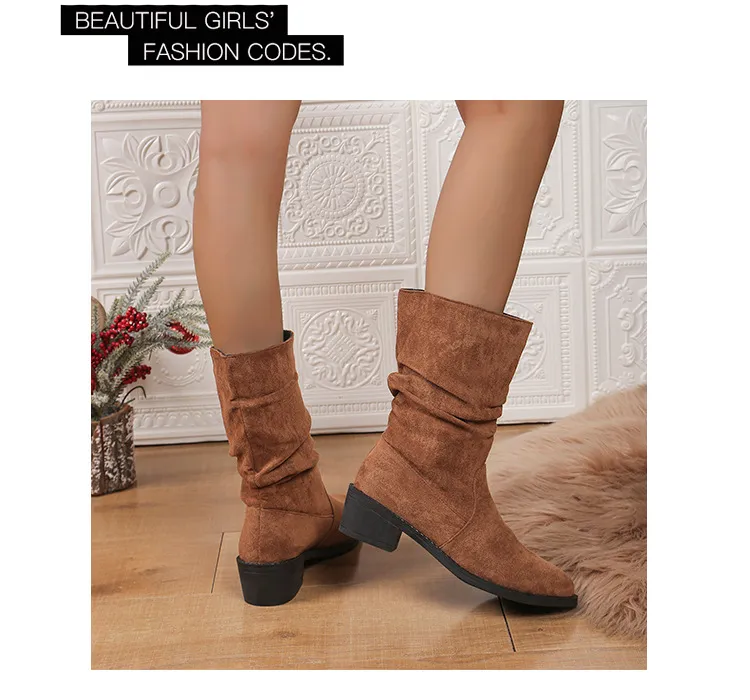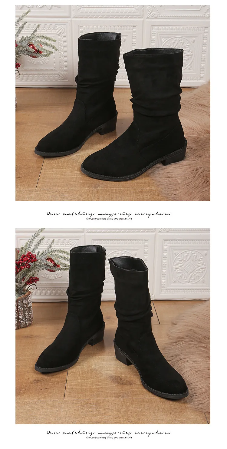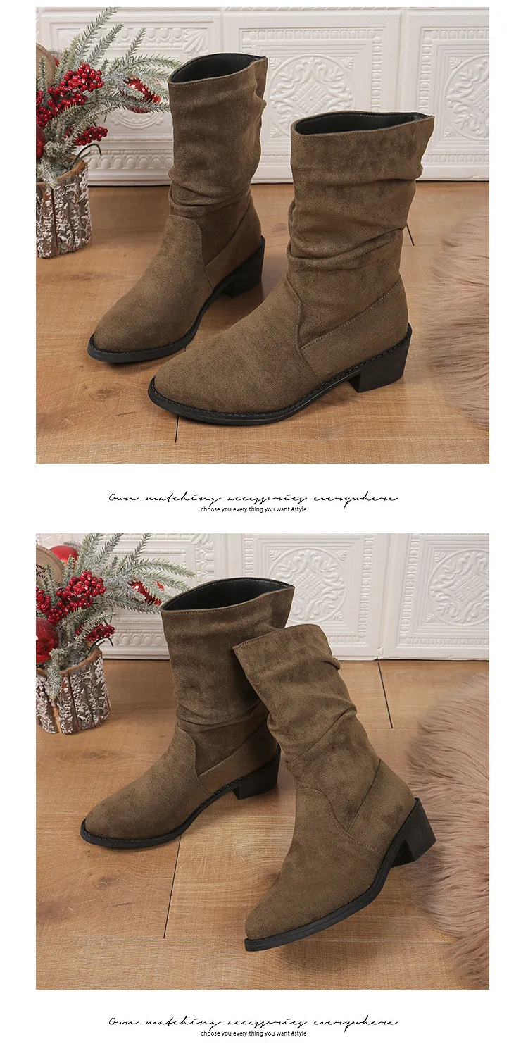 Large Size Thick Heel Pointed Toe Mid-calf Smoke Pipe Boots For Women