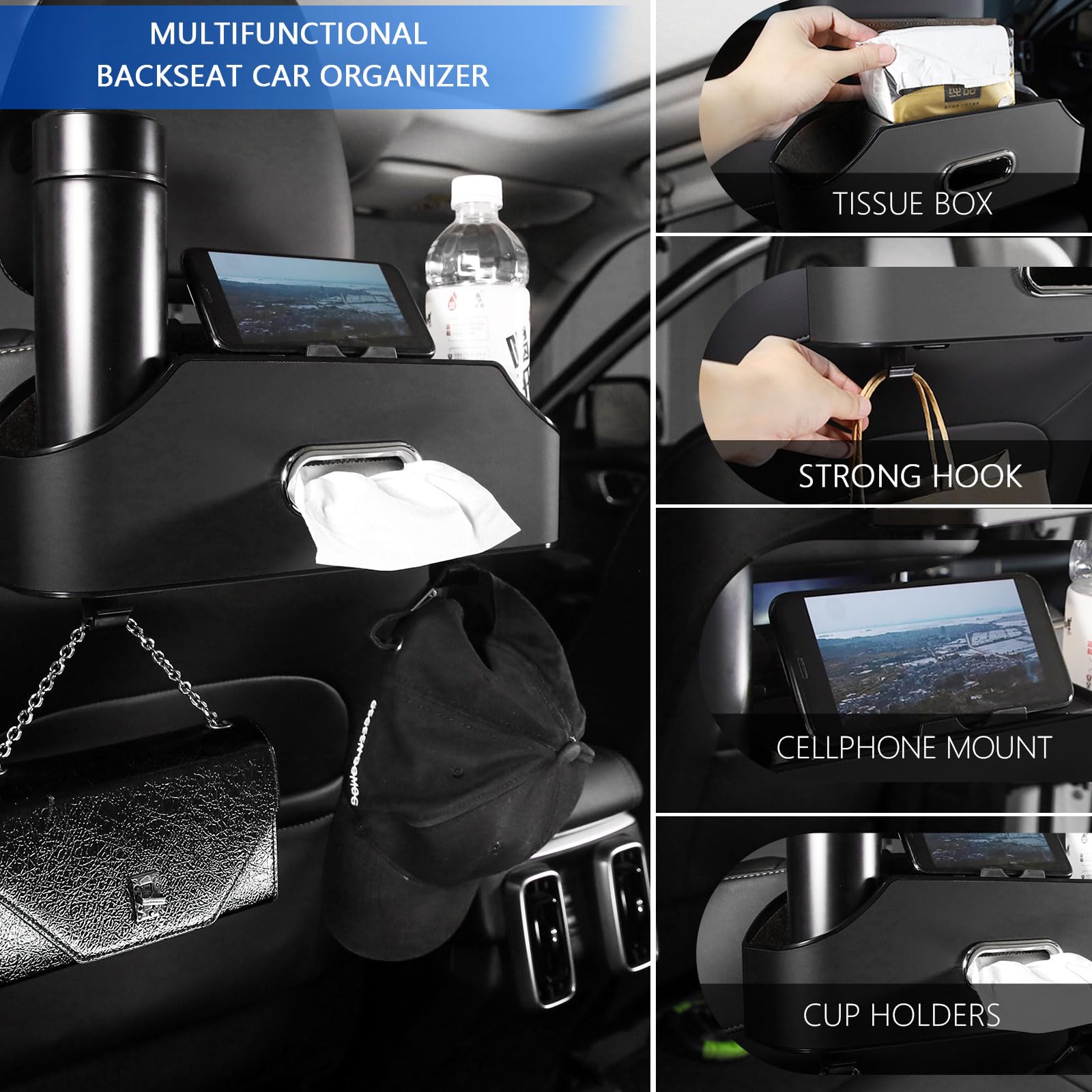 Protect your seats from scratches, spills, stains, scuff marks, mud, dirt and wear and tear using safe, thick, high-quality and durable PU leather and ABS materials to create family travel-friendly rear seat organizers.