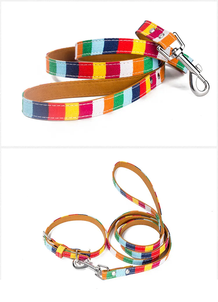Stand out with this Leather Designer Dog Collar’s colorful, rainbow-inspired design. The vibrant hues make it easy to spot your pet and add a
