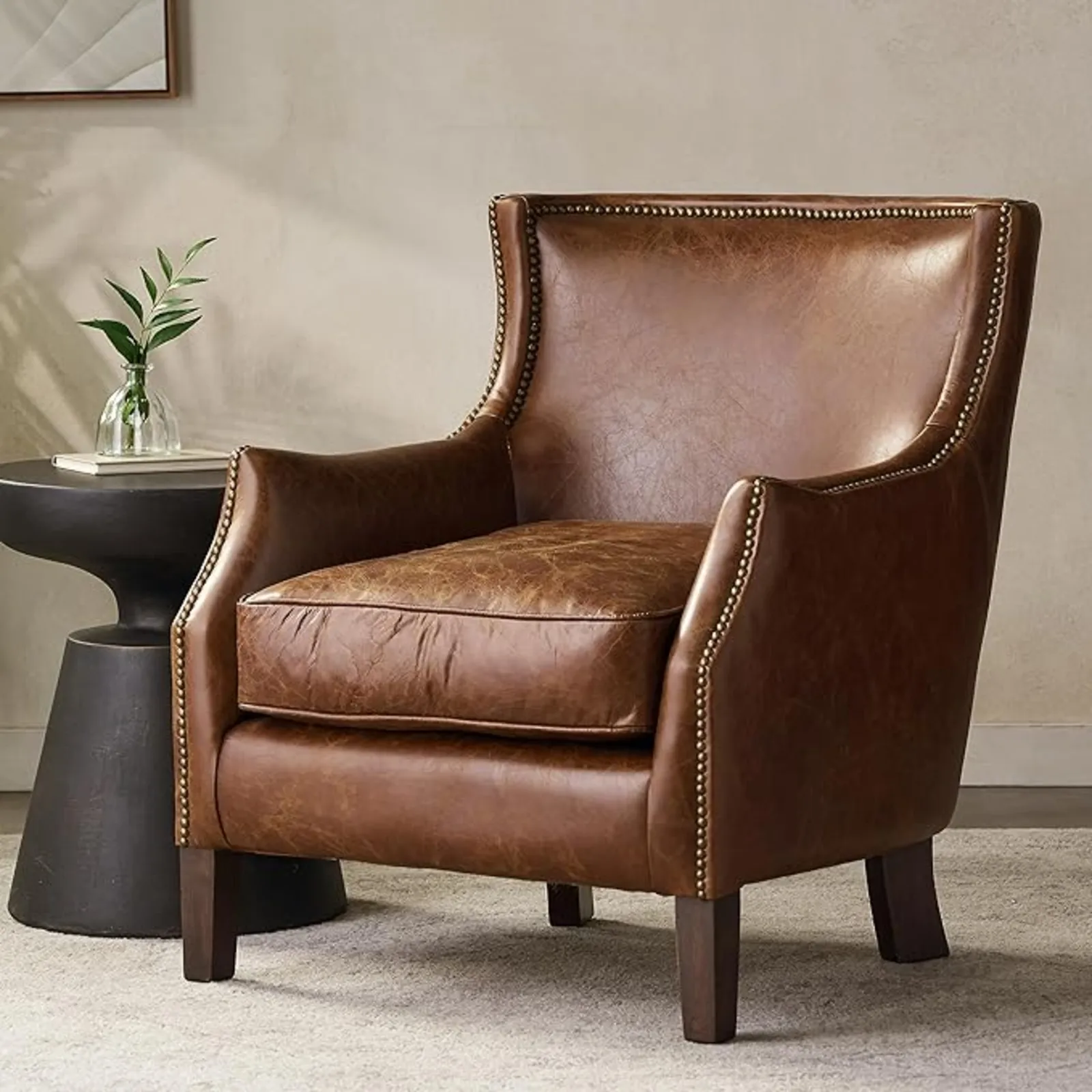 - This chair is sure to be a focal point of your living room, with its strong demeanor and traditionally styled design. The chair is designed with soft leather, studded trim and dark stained legs. The top grain leather used to make this chair ensure that it can last for years to come, and will surely follow your family down the line.