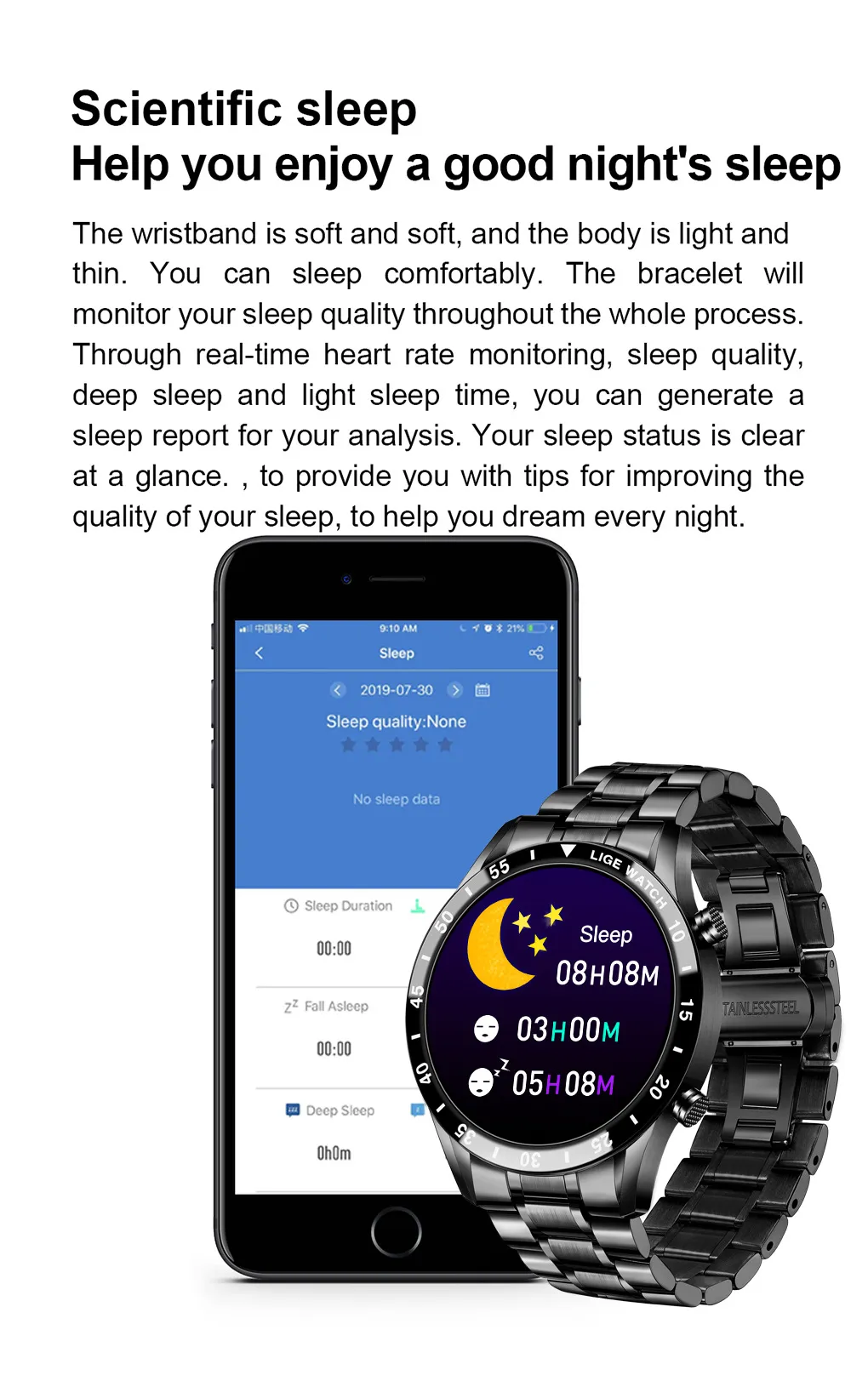 - Sleep Tracking: With its advanced sleep monitoring capabilities, the Lige Smart Watch helps you understand your sleep patterns. It records your light, deep, and REM sleep stages, helping you improve the quality of your rest.
