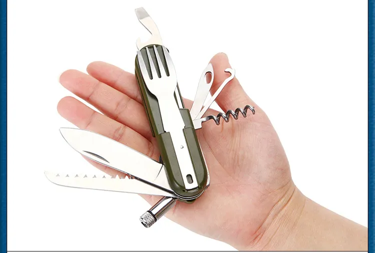 Function: forks, spoons, knives, bottle opener, saws and other functions, LED lights: Open: clockwise rotation. Closed: Shun clockwise